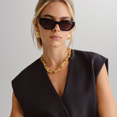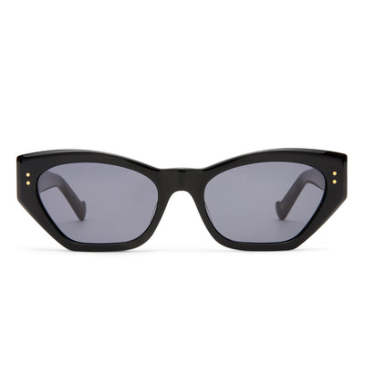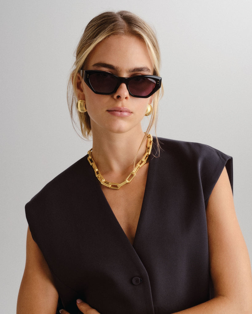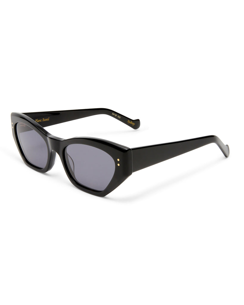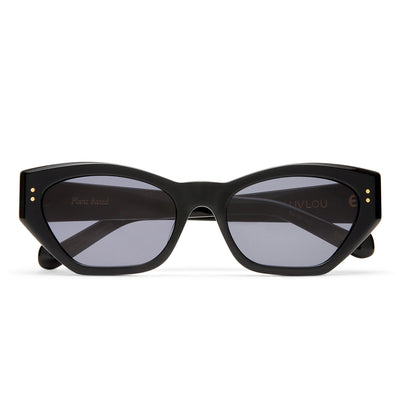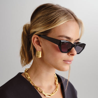 The Sydney Sunglasses in Black by Luv Lou is an elevated cat-eye shape with angled edges, making it feel modern & contemporary. A signature staple that features two small gold rivets on the front of the frame. Handcrafted with a premium black frame with a smoke mono lens.