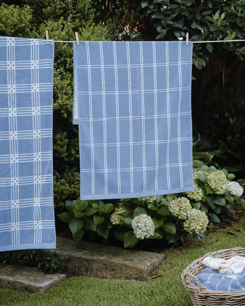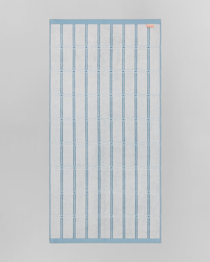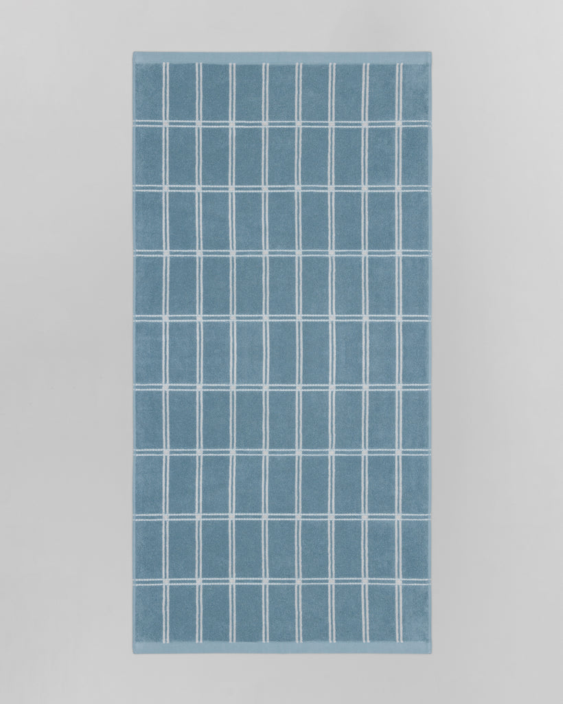 Sorn Bath Towel in Celeste & Chalk by luxury towelling brand, BAINA, a part of their Modern Tartan collection. This reversible design offers a careful study of symmetry and proportion; the Sorn brings a modern sensibility to the bathing space.