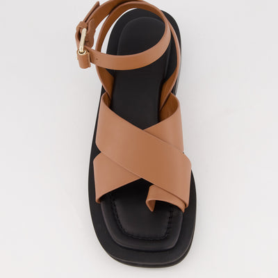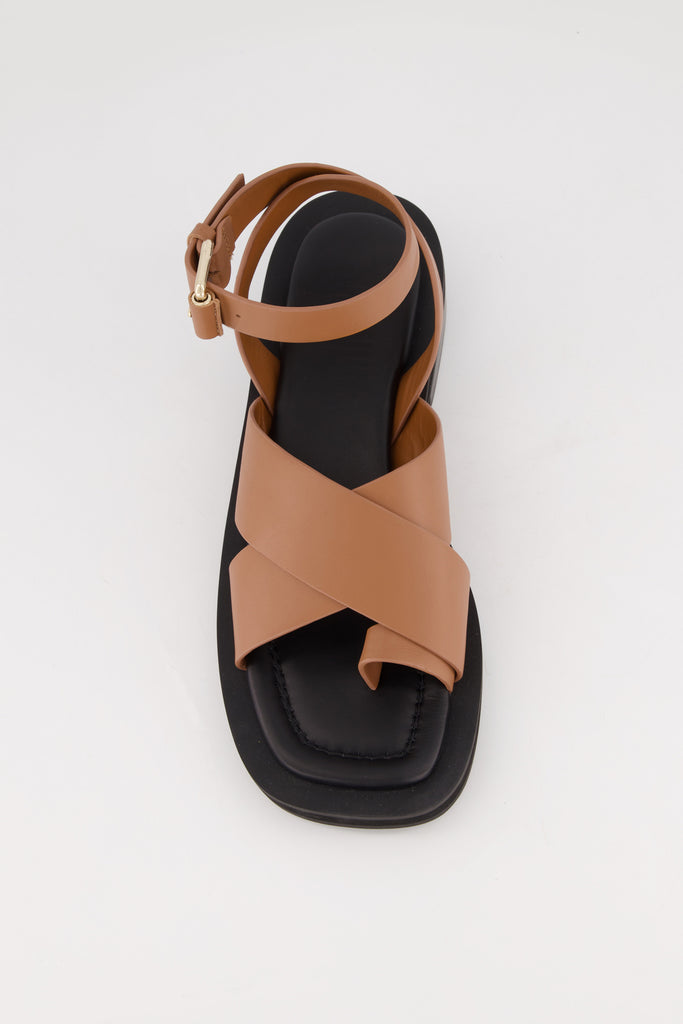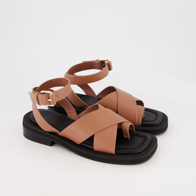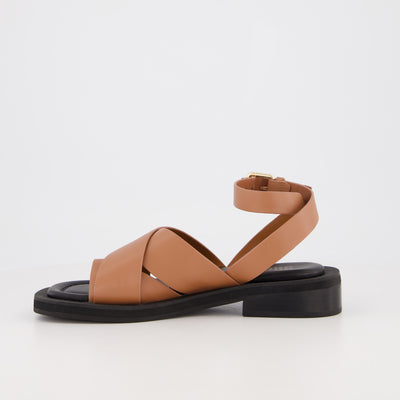 The Camille in Camel by New Zealand footwear brand, Bronwyn is the ultimate sandal in elevated comfort. Designed on a flat sandal construction, the crossover straps secure the foot in a flattering way and the elongated toe thong and wrap-around strap add modern aesthetic appeal. The soft square toe is complimented by a low block heel, creating a perfectly balanced silhouette making the Camille a must-have summer sandal and a true foundational wardrobe piece.