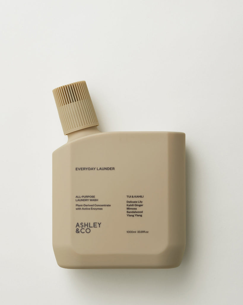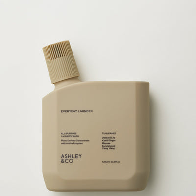 Everyday Launder by Ashley & Co. is about to be your new favourite laundry pal. Everyday Launder is suitable for everyday use, for all temperatures, washers, fabrics & delicates including silks. A plant-derived concentrate, it's loaded with active enzymes to remove stains while reviving fabric with the fresh, iconic scent of Tui & Kahili. All-purpose, this concentrate cleans, whitens, brightens, preserves colour, treats stains and leaves fabrics soft.