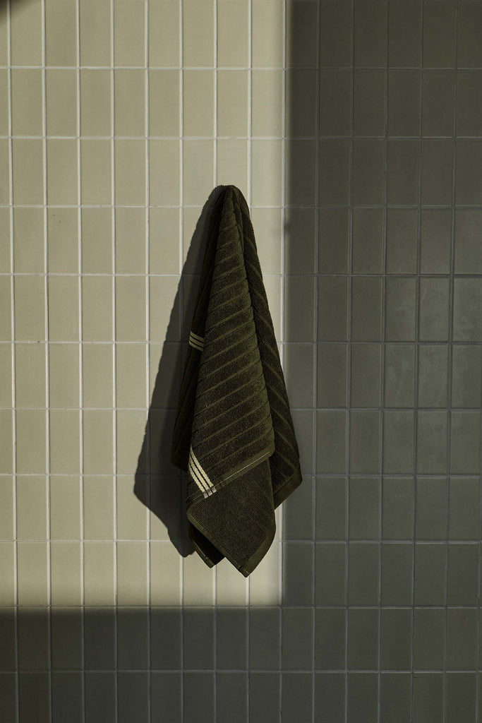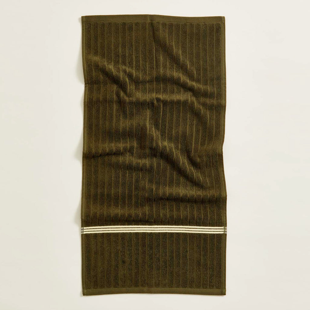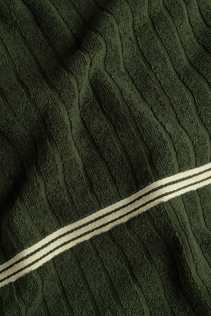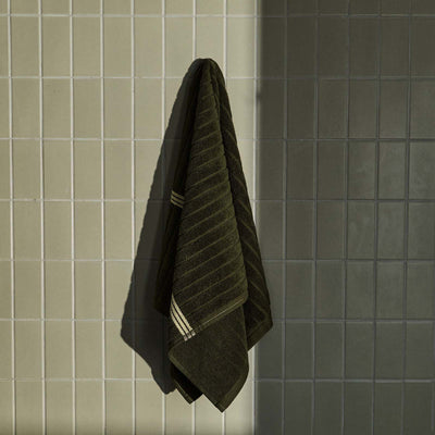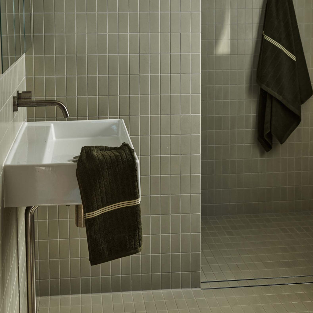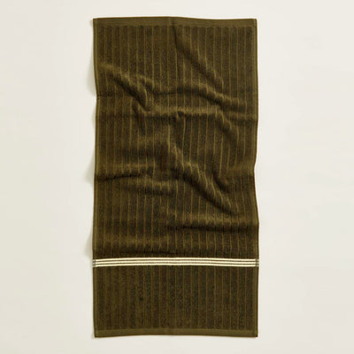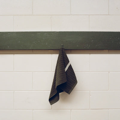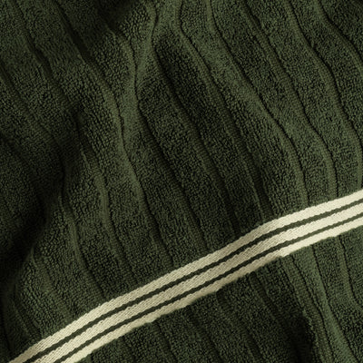 Emerald Hand Towel in Moss by luxury towelling brand, BAINA. Reminiscent of heritage club rooms, this towel is defined by textural moss rib accented by three crème stripes. Inspired by the spaces where an individual sits, inwardly connected to, the post-match exhale. Pairs nicely with the St Balthans bath towel.