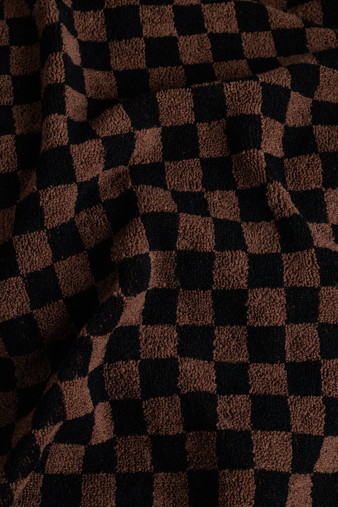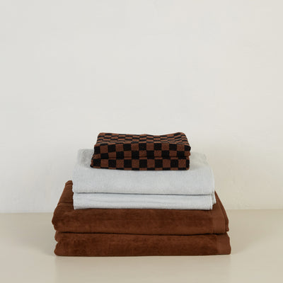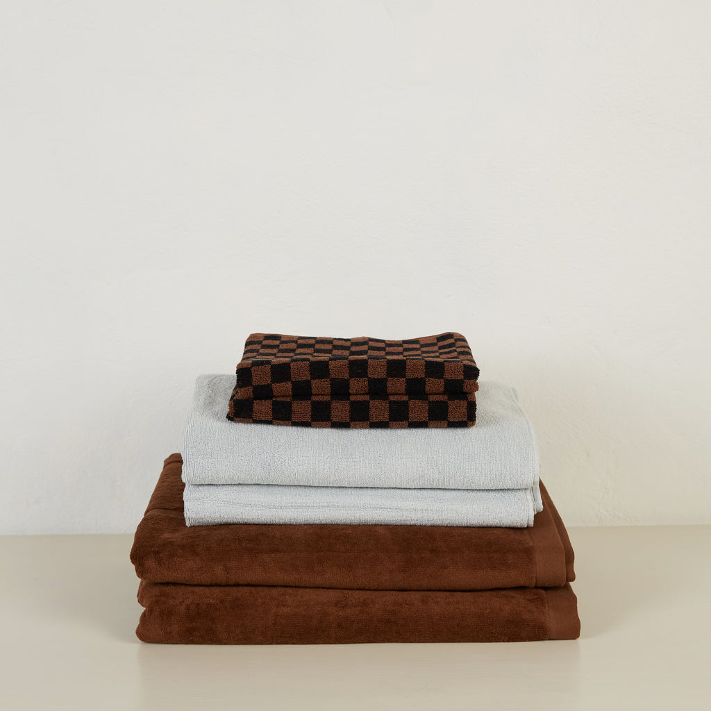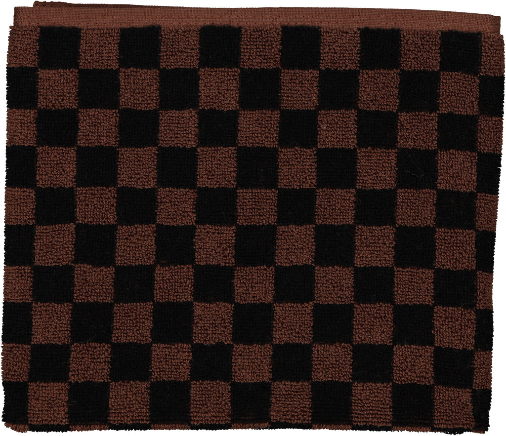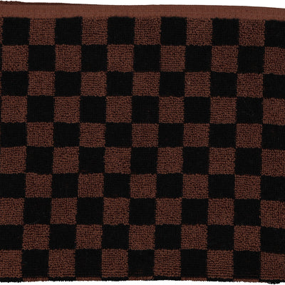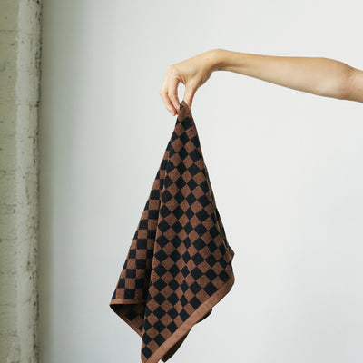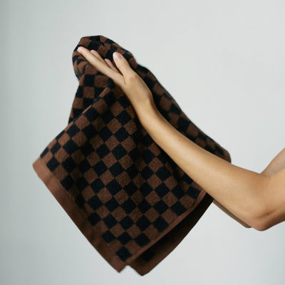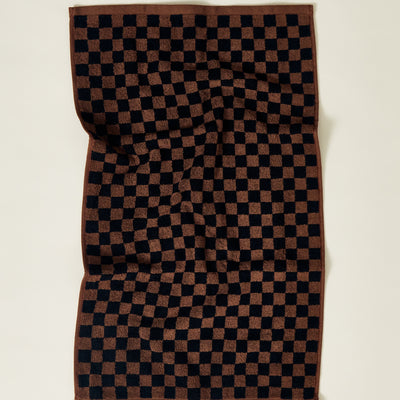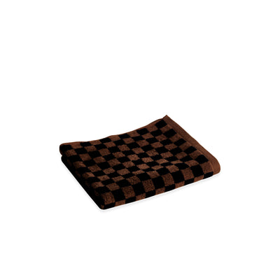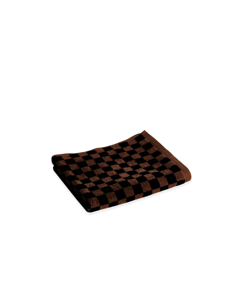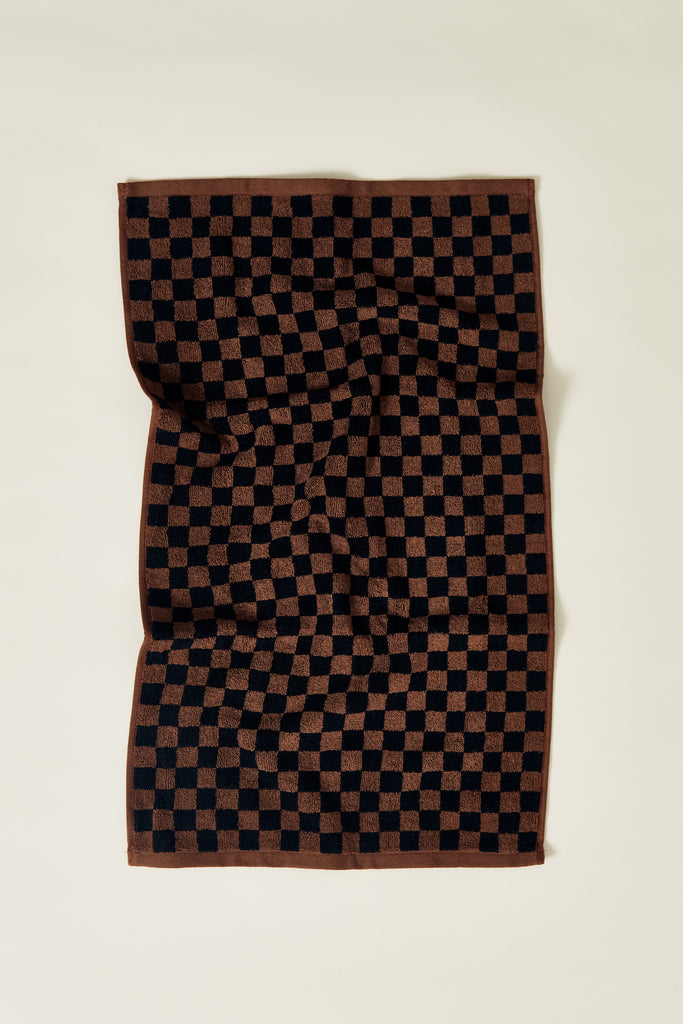 Josephine Hand Towel in Tabac & Noir by luxury towelling brand, BAINA. The Josephine features a playful checkerboard print, synonymous with the BAINA brand. This hand towel makes for a subtle disruption in any bathroom or ensuite. Pairs nicely with the Greenwich bath towel.
