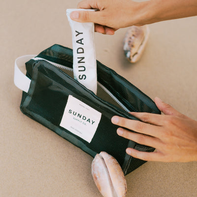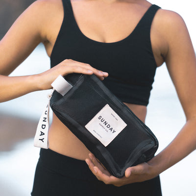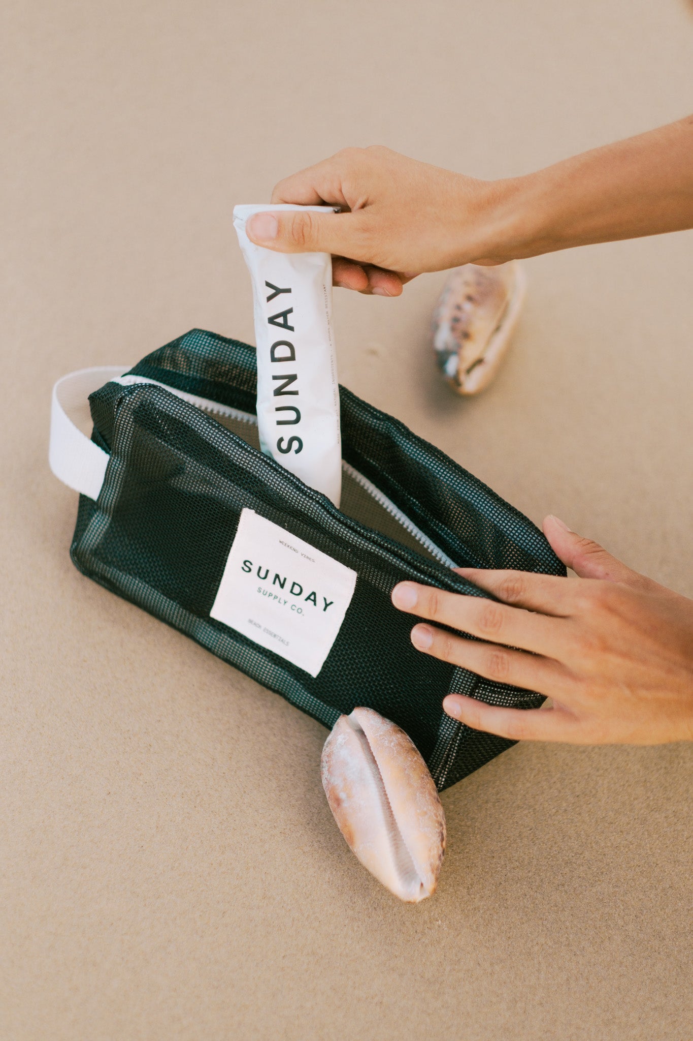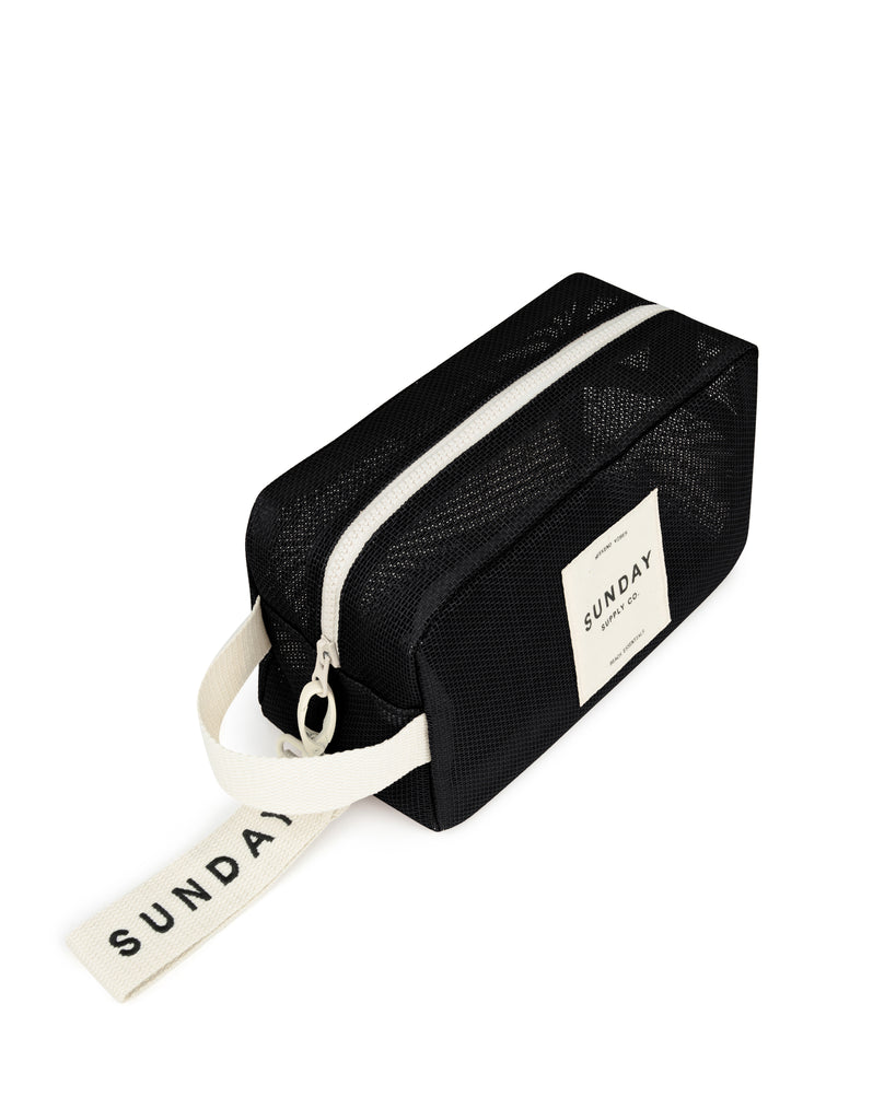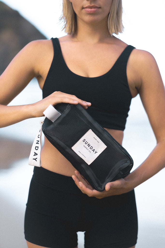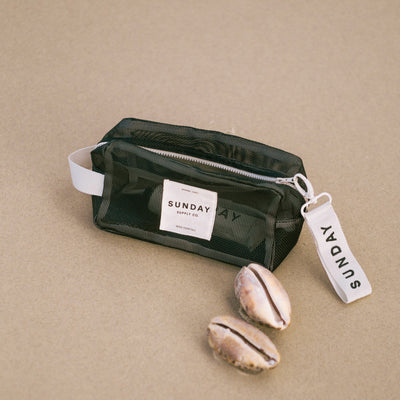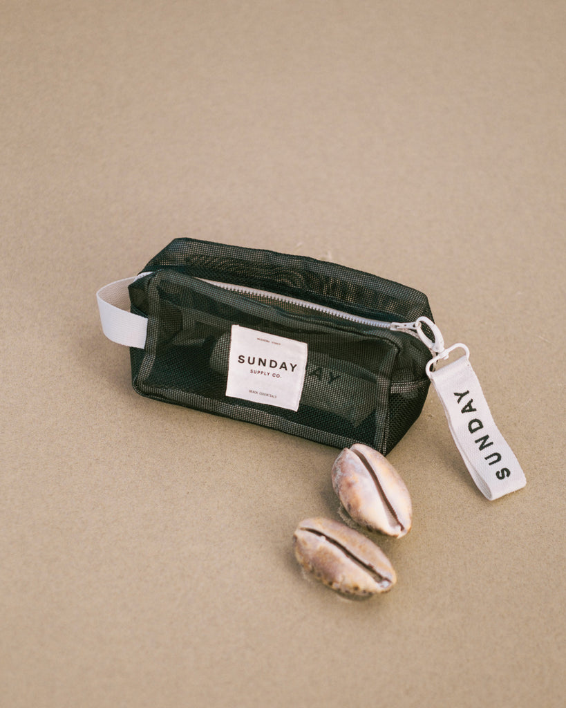 Elevate your coastal day with Sunday Supply Co's Mesh Accessories Pouch in Black Rock. A simple, effortless pouch designed to keep all your essentials safe and secure. A place to put your keys, phone and sunscreen and then throw it into your beach bag, and shake it to get rid of all the sand. Featuring a removable, embroidered zipper keyring for easy carrying.