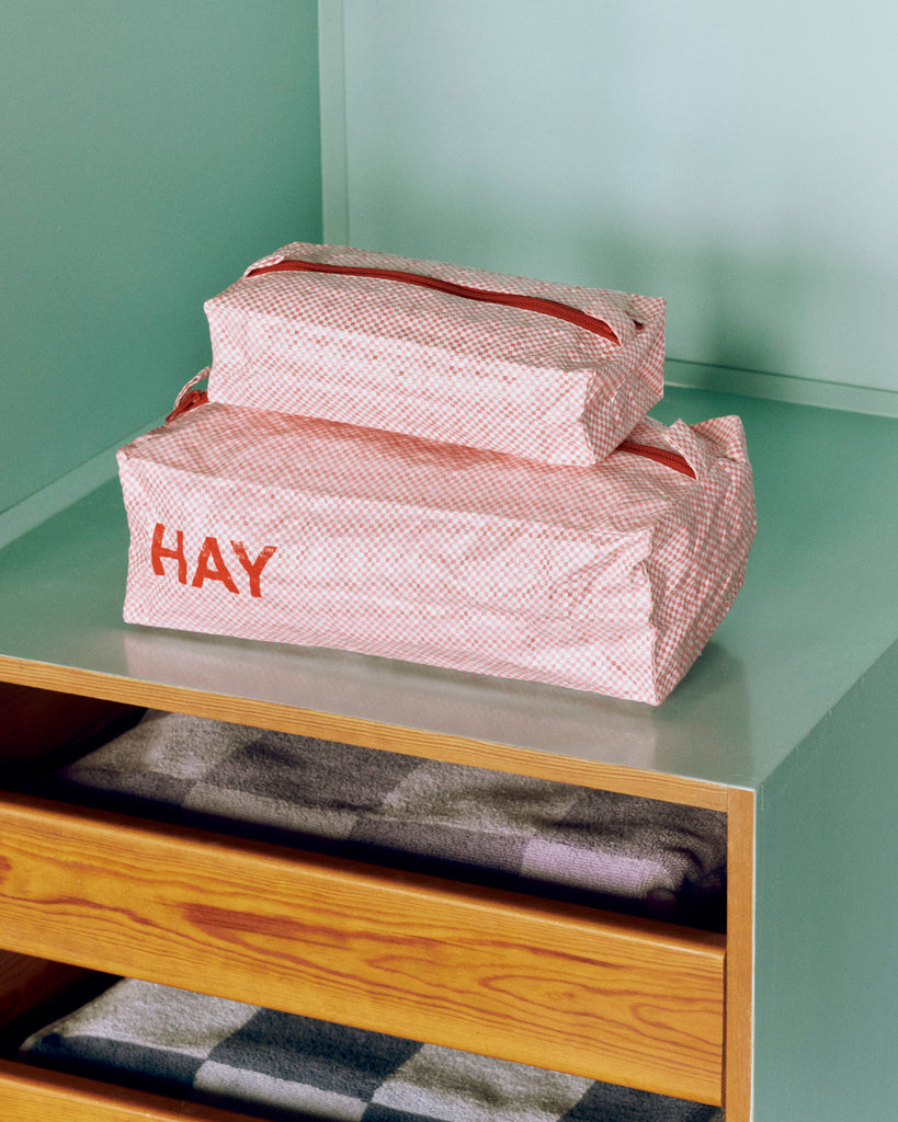 The Candy Box Bags in Pink by HAY are a set of practical wash bags for storing and transporting cosmetics and bathroom essentials. Featuring a zip fastening and HAY logo, they keep your items securely enclosed without getting wet. Made in a strong and durable waterproof material containing 80% recycled plastic, this set of 3 different-sized wash bags is perfect for your organisation's needs.