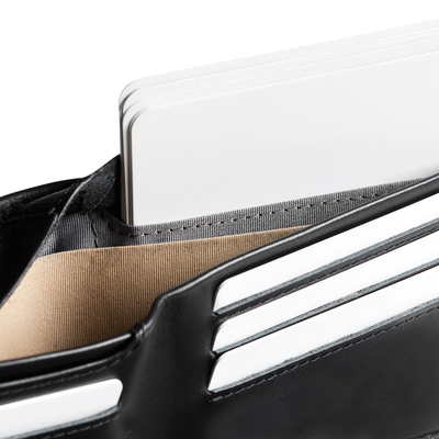 The Hide & Seek wallet in Black by cult favourite daily accessories brand, Bellroy is often people’s first landing point in a journey to slimmer wallets. It looks conventional enough, but still has many great tricks to slim it. We recommend storing business cards in the tucked away card section, as it keeps them protected and in good condition.