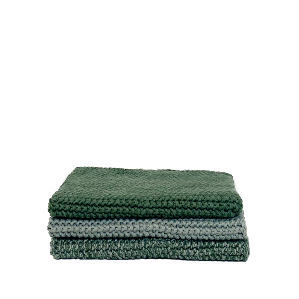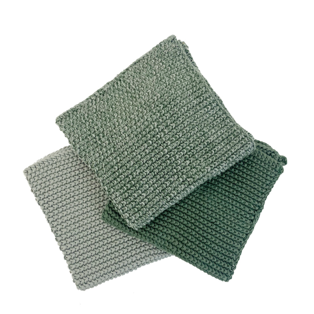Knitted Cotton Cloths in a set of 3 sage tones. Perfect for use in the kitchen, as an alternative to a face cloth or for babies.