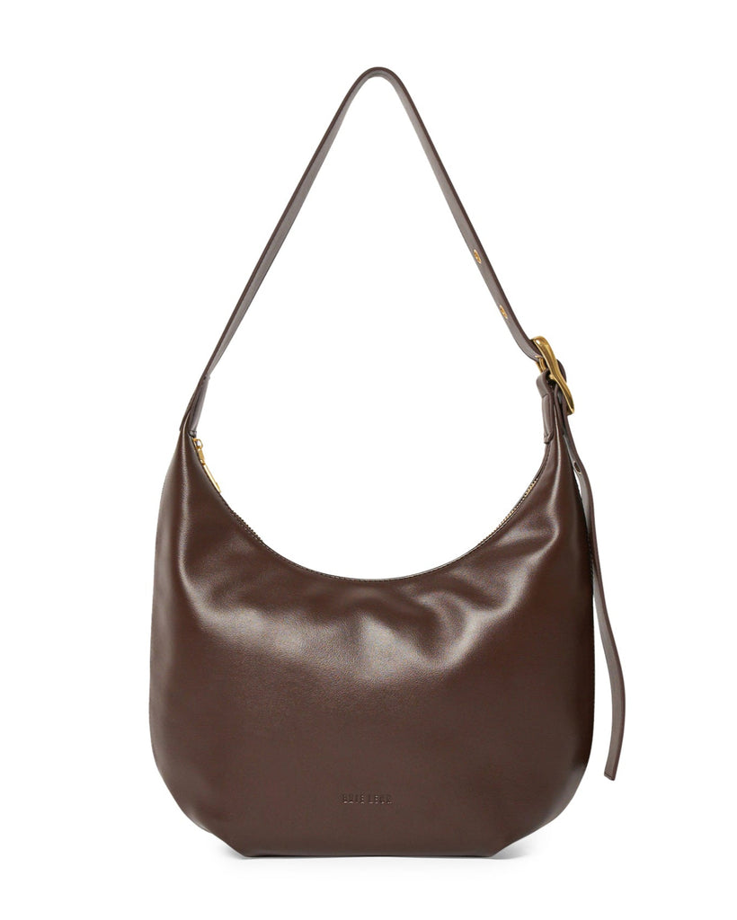 This large version of the most-wanted Everyday Croissant Bag in Chocolate by Brie Leon. Embellished with a brass buckle and multiple eyelets to adjust to the ideal length, its ample size takes you from work to the weekend. Featuring a zip closure and two internal pockets, the Large Croissant has everything you need in a daily bag.