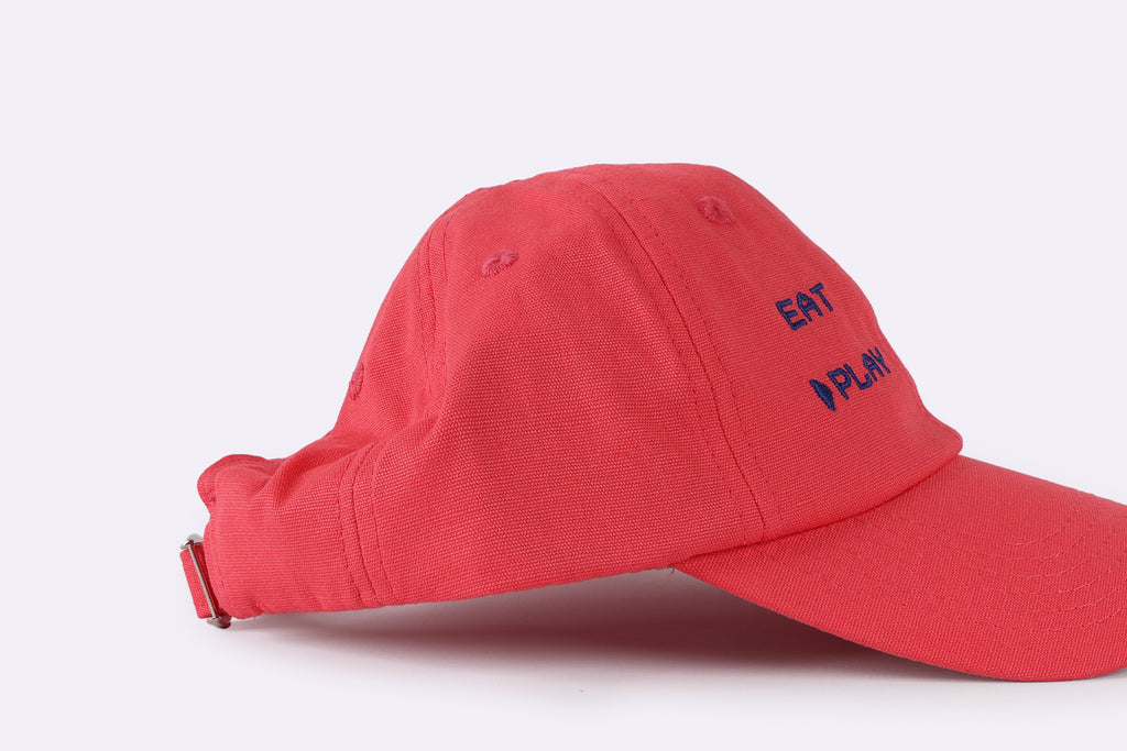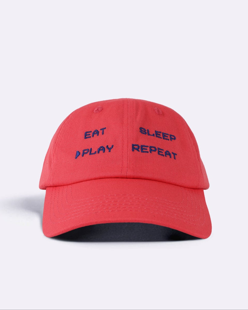 The Eat, Sleep, Play, Repeat Cap by Bbobbie features a coral base and a cobalt blue embroidered detail. The adjustable back strap ensures the perfect fit.