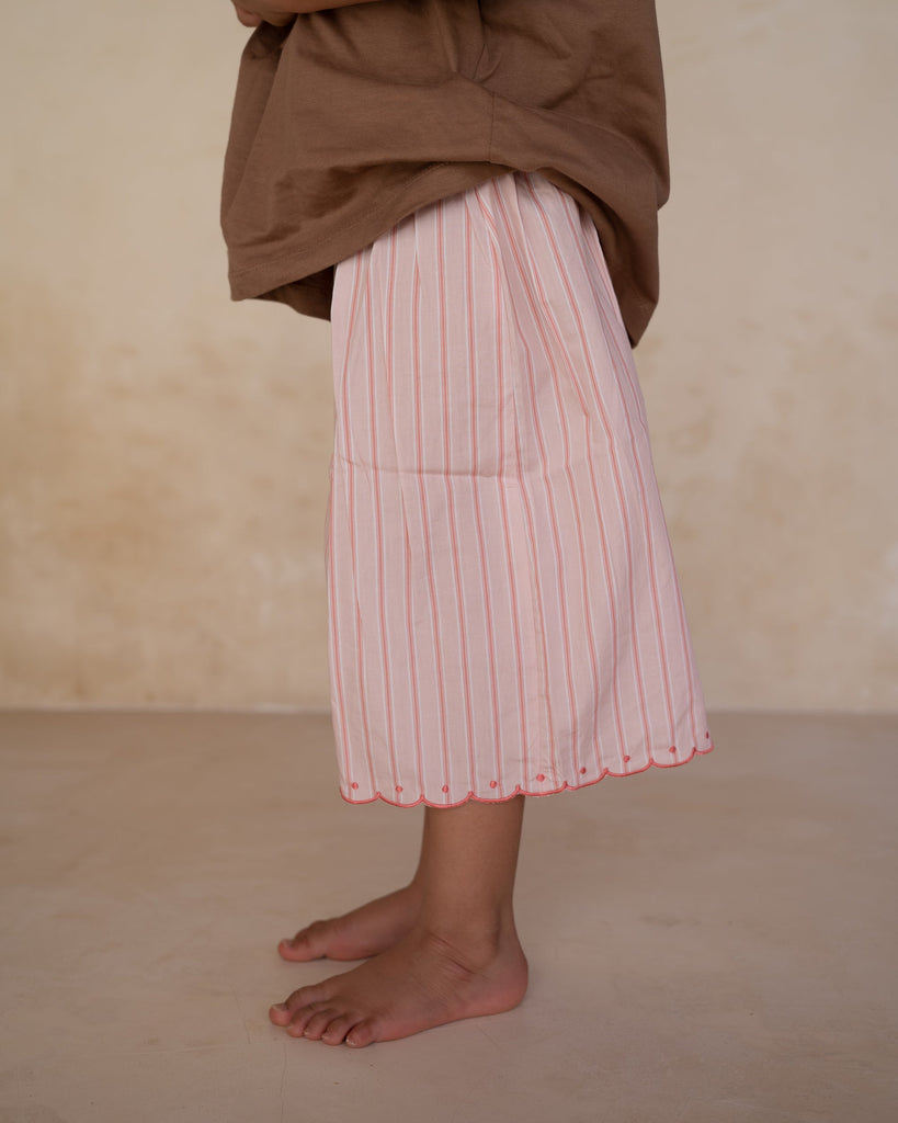 Crafted from durable cotton poplin, the Fleur Pant in Illoura's new Pink Stripe is a playful essential with a relaxed 3/4 wide-leg silhouette. Featuring custom stripe detailing and scalloped embroidery at the hem, it combines style with comfort. An elasticated waistband and functional drawstring ensure an easy, adjustable fit for all-day wear.
