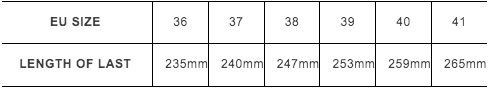 Sizing: Please measure the length of your foot to allow 6-10mm more to last length otherwise toes will hit the end of the shoe. E.g. if you measure 255mm you will take approx size 40 or 41. Please refer to the size guide image for lengths.