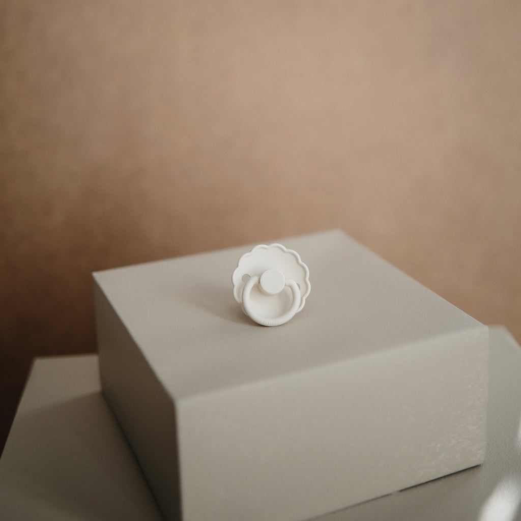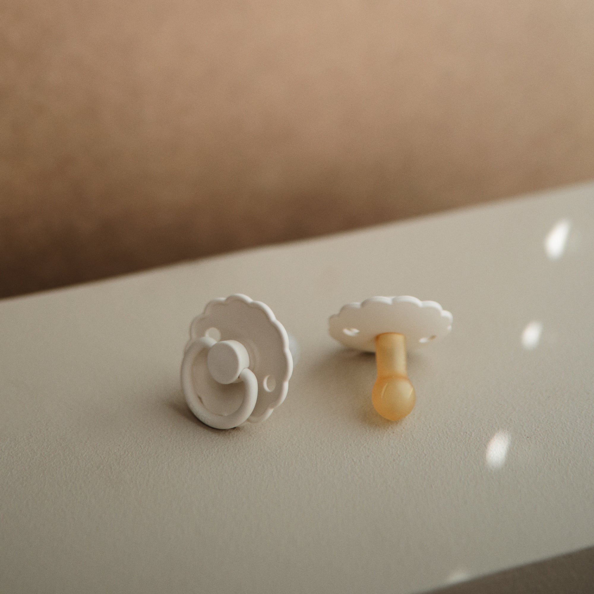 Daisy Pacifier Set in Cream by Danish brand FRIGG. These pacifiers are crafted with safety and beauty in mind. The FRIGG line of natural latex pacifiers has been thoughtfully designed for your baby's comfort. The outward curve keeps the pacifier off their delicate skin, while features like air holes and a security handle ensure your baby stays safe. Available in a range of soft colours, FRIGG pacifiers make a beautiful addition to your collection of baby essentials.