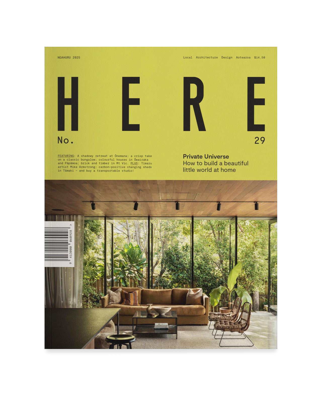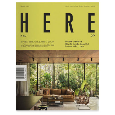 Issue 29 of Here is dedicated to building a beautiful little world at home. On the cover: a shadowy retreat at Ōnemana by EMA Architects that brings the outside in. Elsewhere - a crisp take on a classic bungalow by Space Division; Pac Studio brings colour and function to a 40s bungalow without expanding the footprint; Studio Brick Architects create a modest but meticulously detailed home in an established garden at Pāpāmoa.... And a.k.a Architects bridge the gap between heritage and commercial with a simple addition in Mount Victoria. And more.