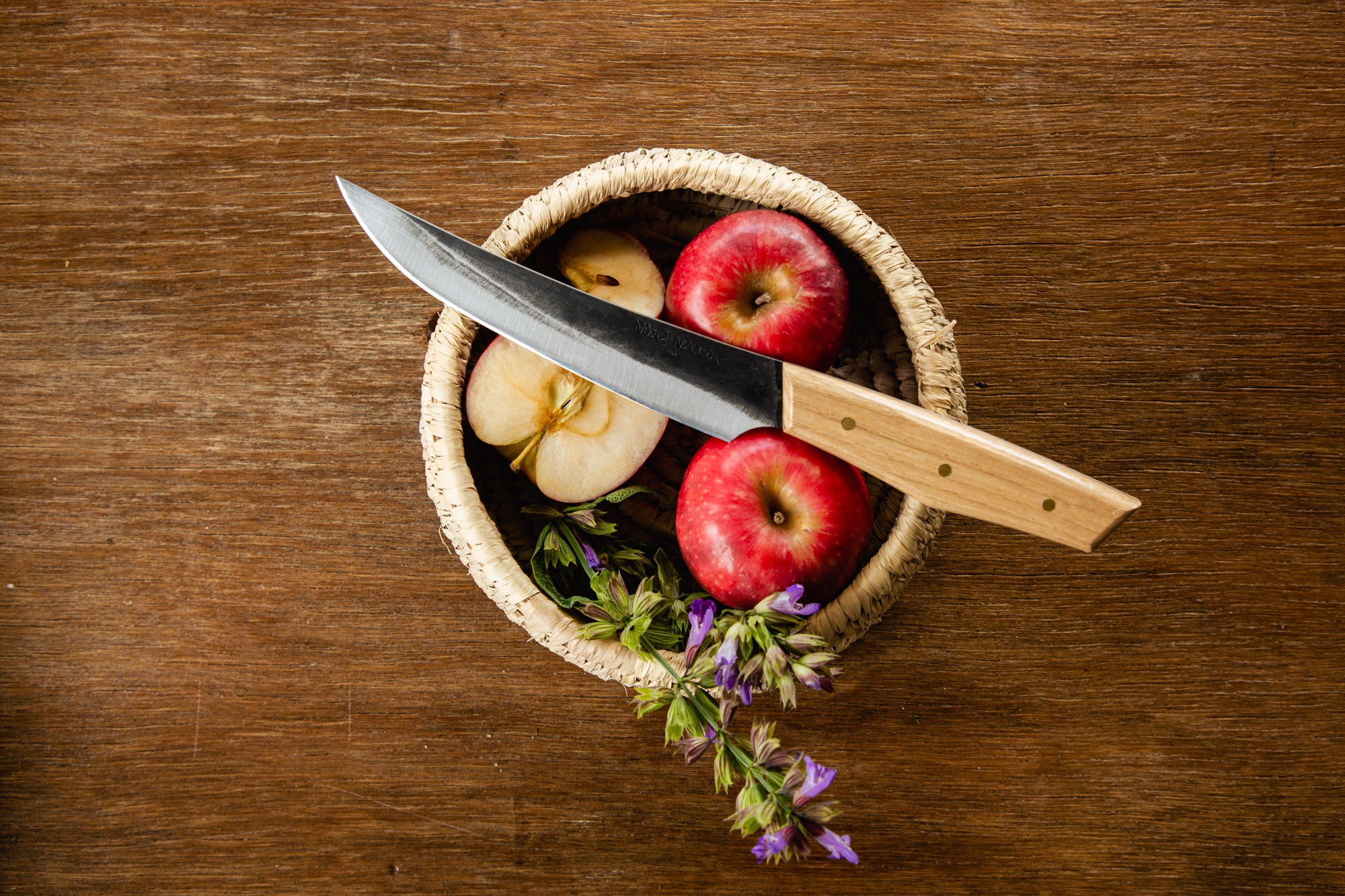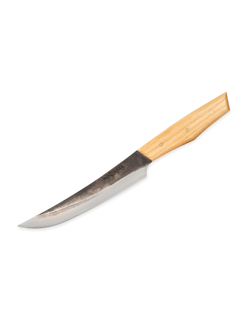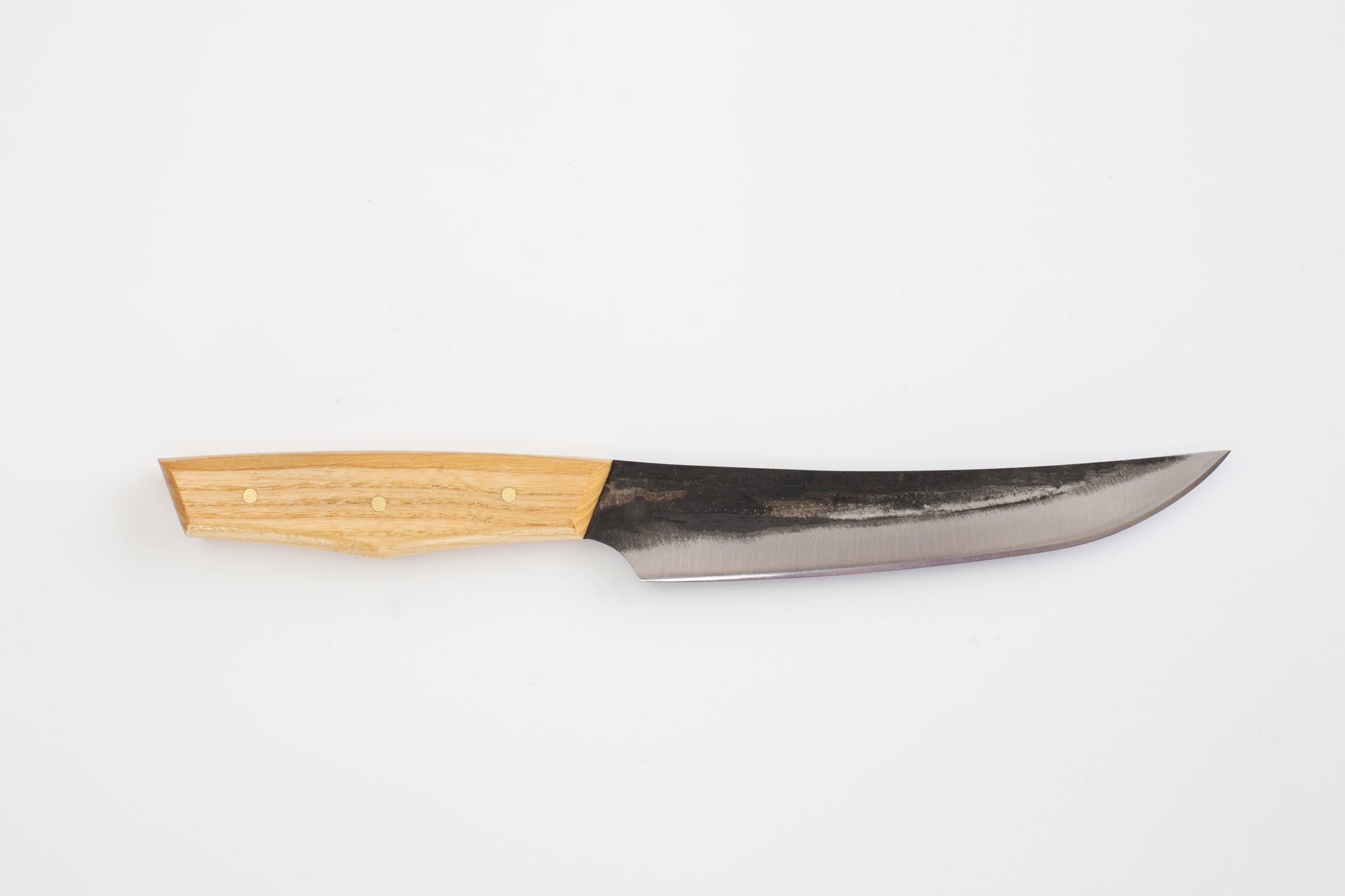 The No. 2 knife is made from Swedish carbon steel, produced from recycled saw blades. The handle is crafted from sustainably sourced American Ash wood. Three brass rivets hold together the blade and the handle producing a simple design to suit any kitchen. Individually crafted and guaranteed against faulty craftsmanship.