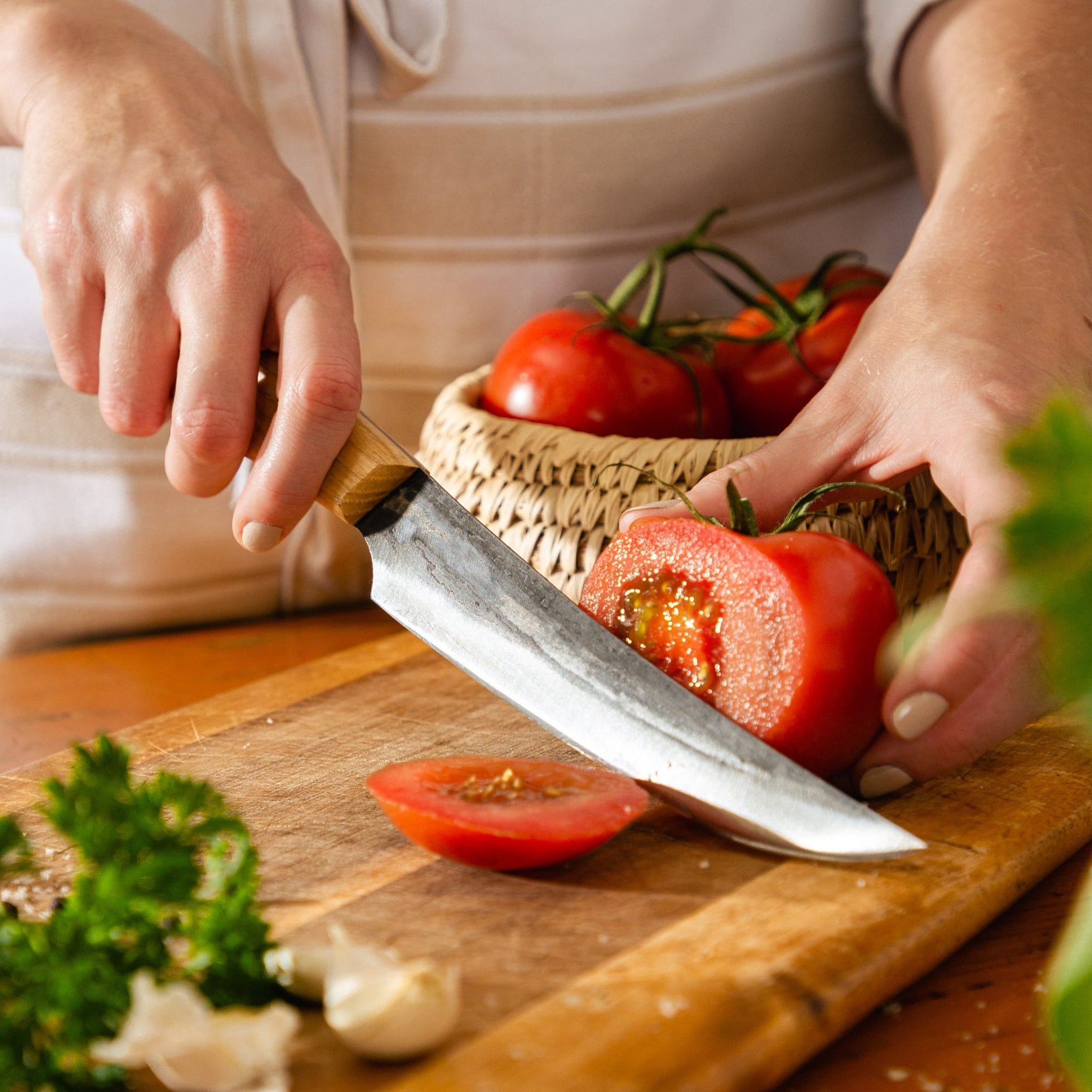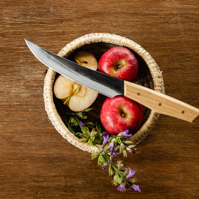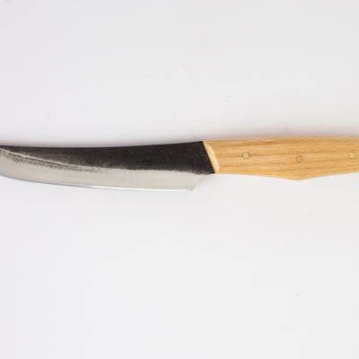 Care: Carbon steel knives have higher wear resistance, greater strength and a better edge-holding ability compared with stainless steel. Your carbon steel knife will develop a patina with use but does need to be kept dry to prevent rust. We recommend a quick handwash and dry as soon as you've finished using the knife.