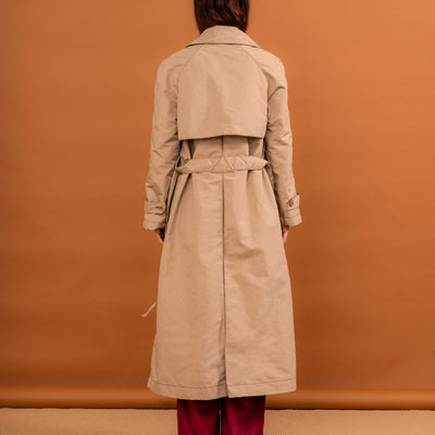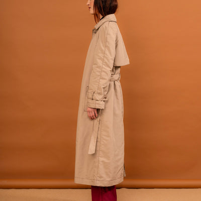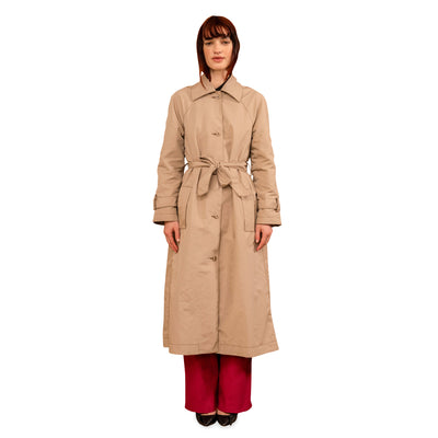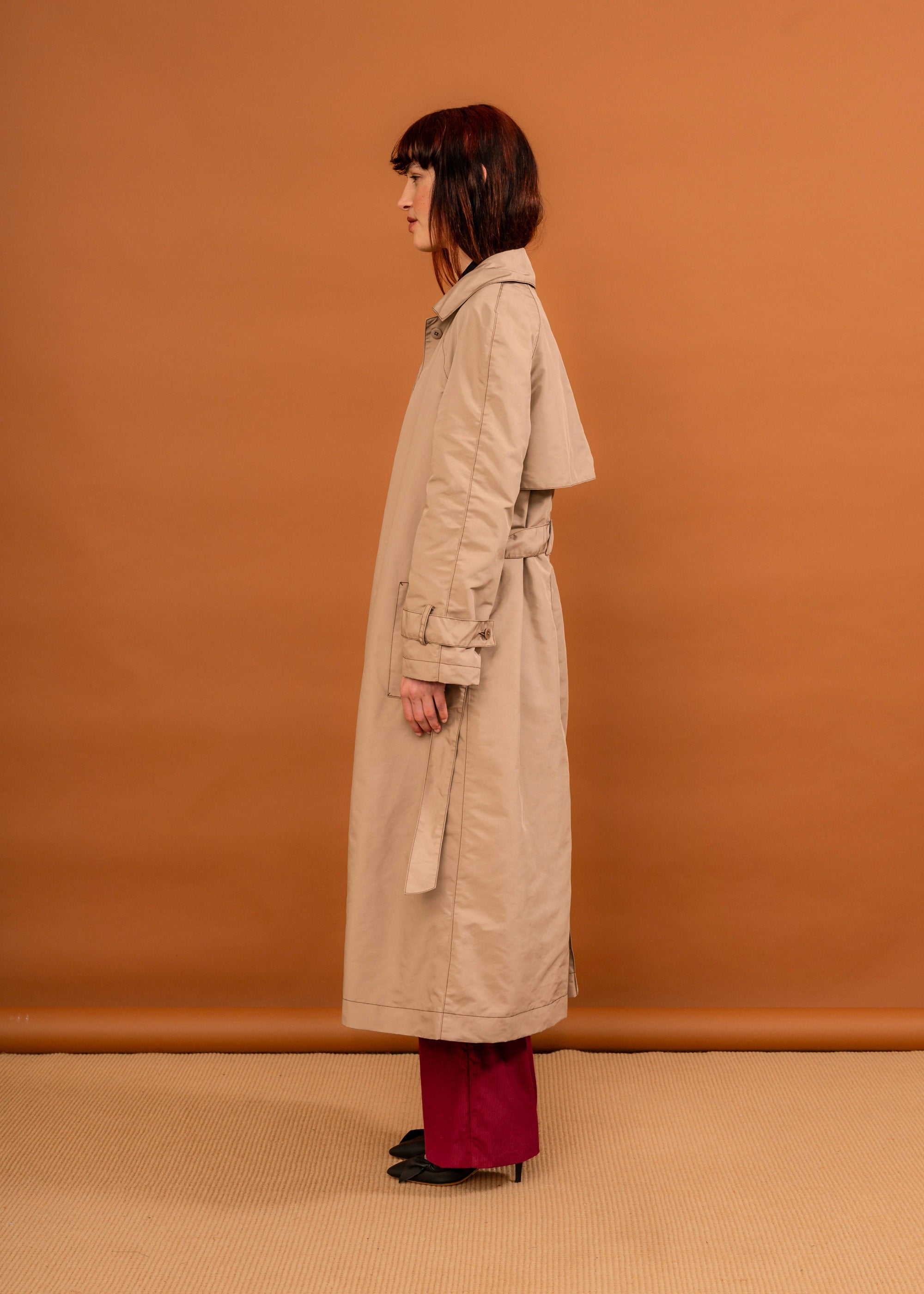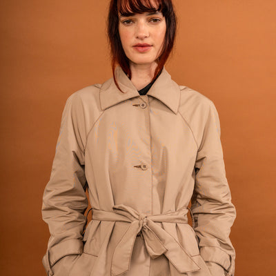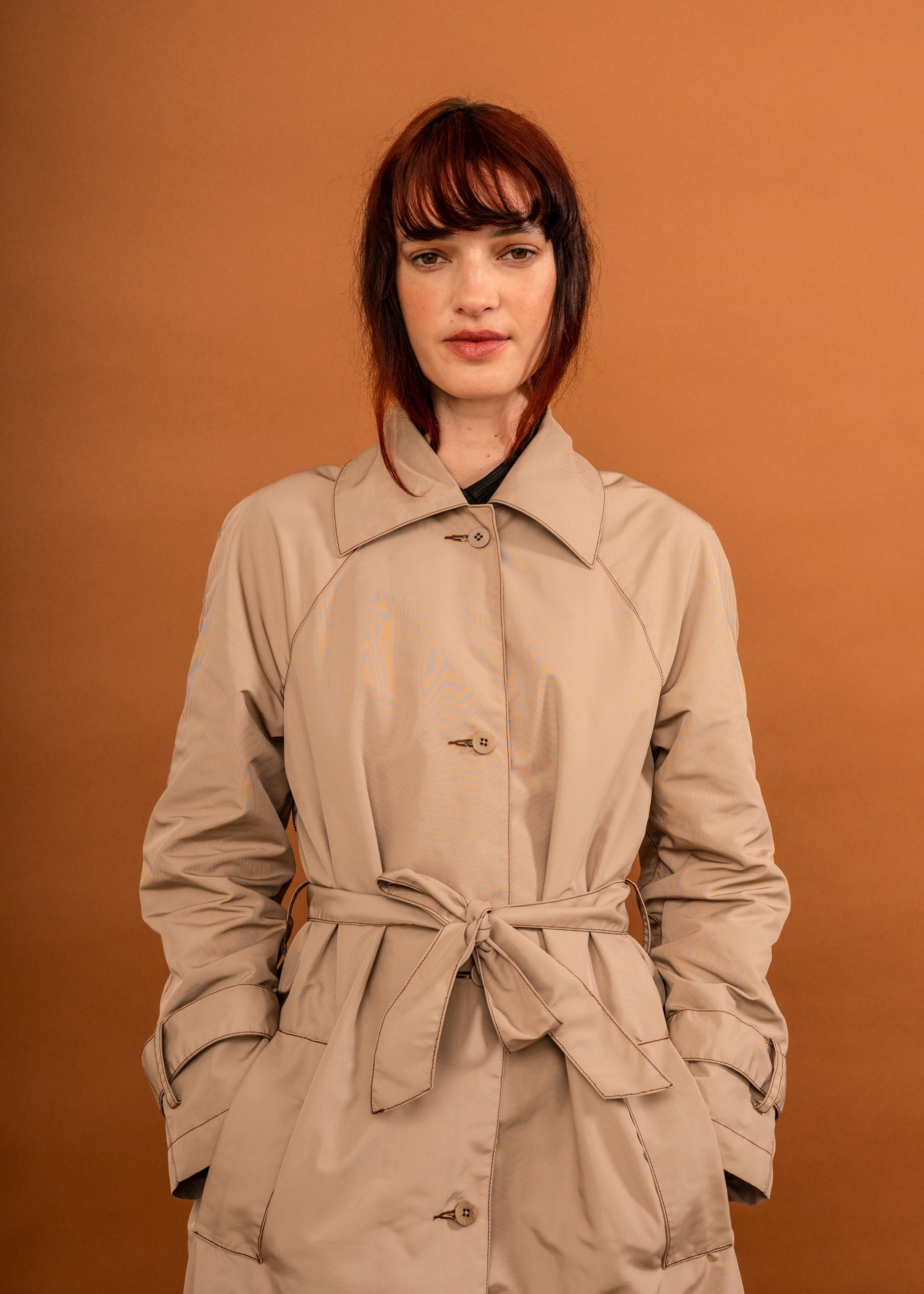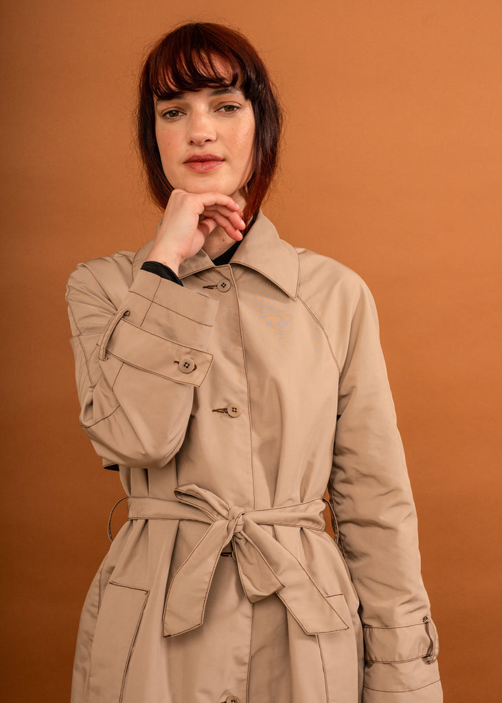The Sunshower Trench Coat in Cappuccino by Penny Sage is a long-length trench crafted in a nylon memory raincoat fabric. It's fully lined in light cotton in the body and viscose in the sleeves and features a raglan sleeve, vertical flap pockets, and a belt at the waist. The back features a storm flap and a pleat for extra movement through the body. This coat is showerproof and will offer protection from light rain showers but isn't suitable for very heavy downpours or persistent rain.
