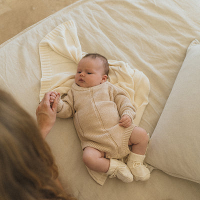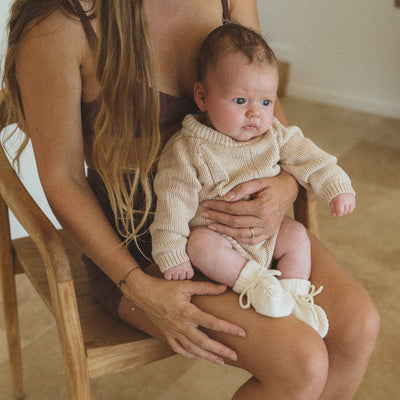Warm up with these sweet little Alba Booties in Vanilla by Illoura the Label. Featuring ribbed finishings and functional ties, the Alba Booties are a style that will be loved for generations to come and make the perfect gift for a newborn.