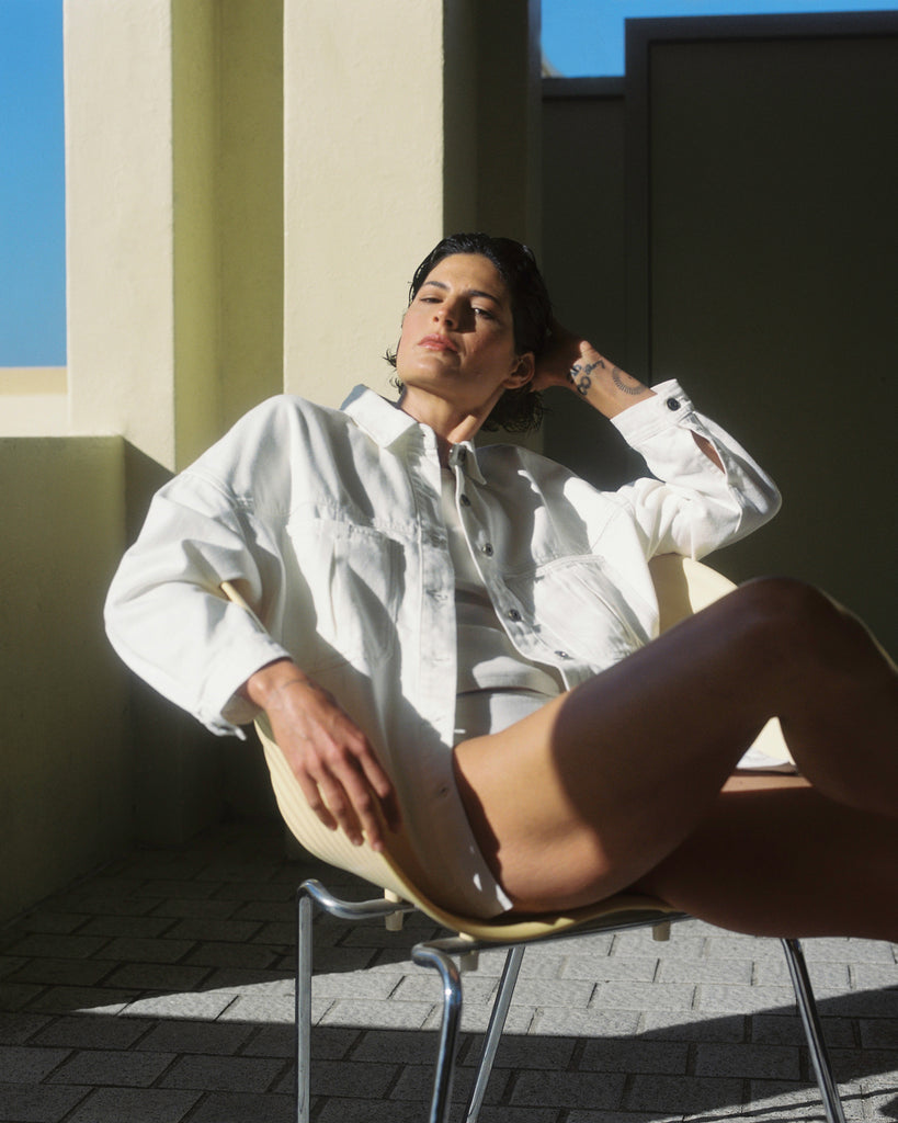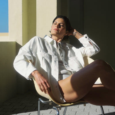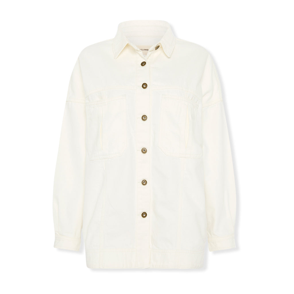 The Jenny Shacket in Winter White by Outland Denim is a lighter answer to your classic denim jacket with increased drape and movement, making it the perfect layering companion all year round. A timeless, oversized denim jacket featuring a dropped shoulder, relaxed body and sleeves, paired with classic topstitching and contrasting buttons.