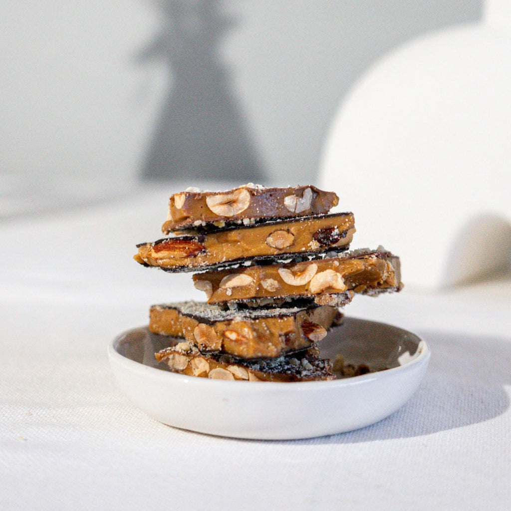 Handcrafted Hazelnut Toffee by The Confectionist, using roasted hazelnuts covered in a generous layer of milk chocolate and sprinkled with crushed hazelnuts. Enjoy down to the last bite!