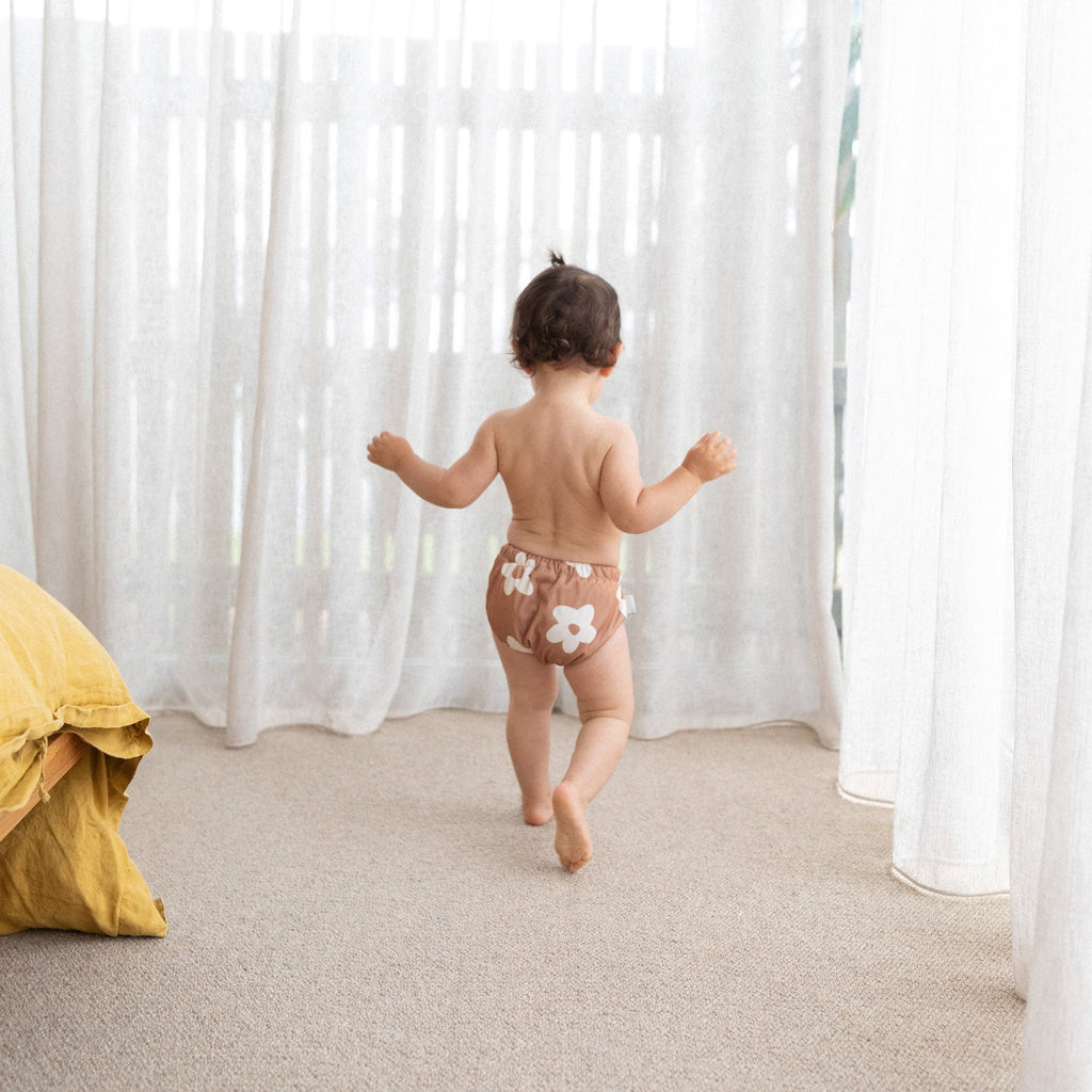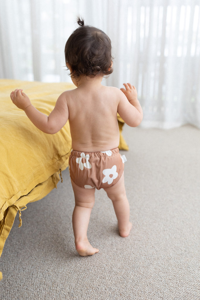 The Posy Reusable Swim Nappy by Pekpi. Featuring a drawstring closure and elastic waist and legs for a comfortable and secure fit to prevent leaks.