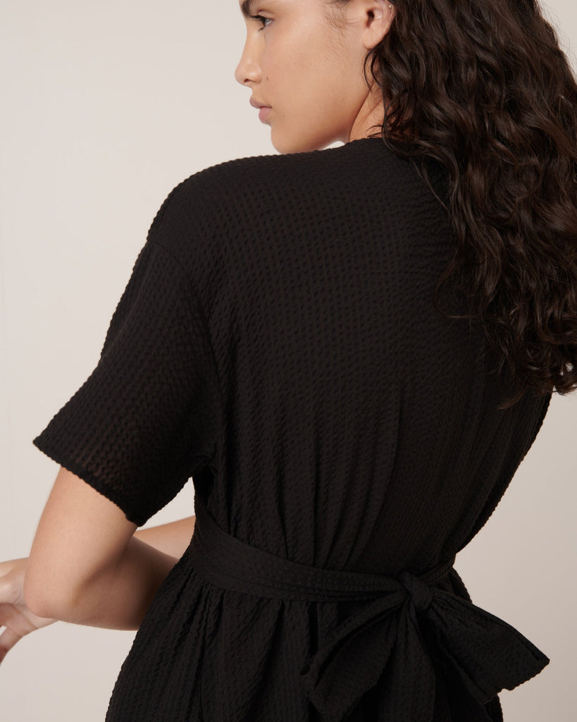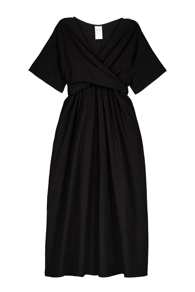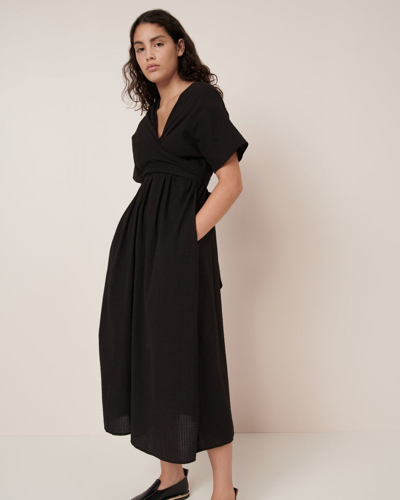 The Composer Dress by Kowtow is defined by its wrap front detail, creating a flattering V-neckline. Crafted from Kowtow's new textural organic cotton seersucker, it features a standard fit with subtle shaping through the back bodice and inseam pockets for effortless functionality.