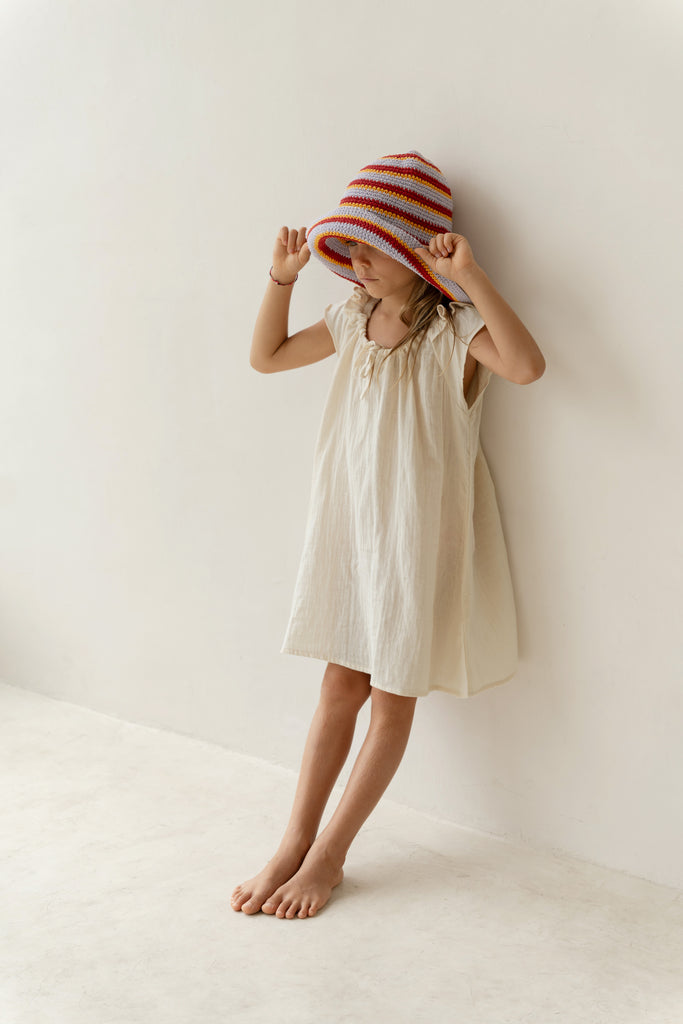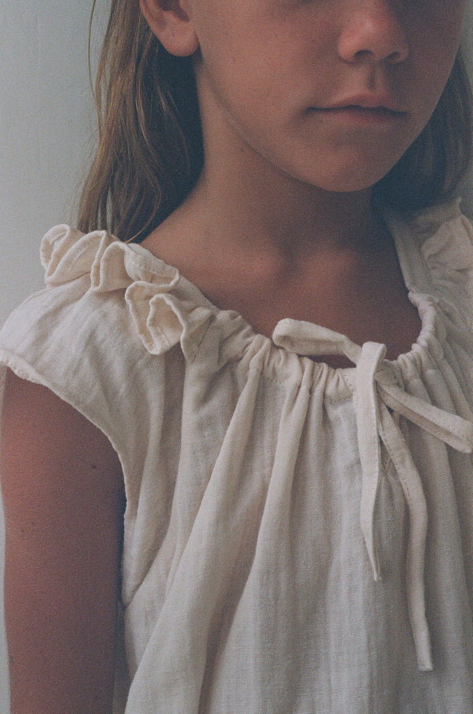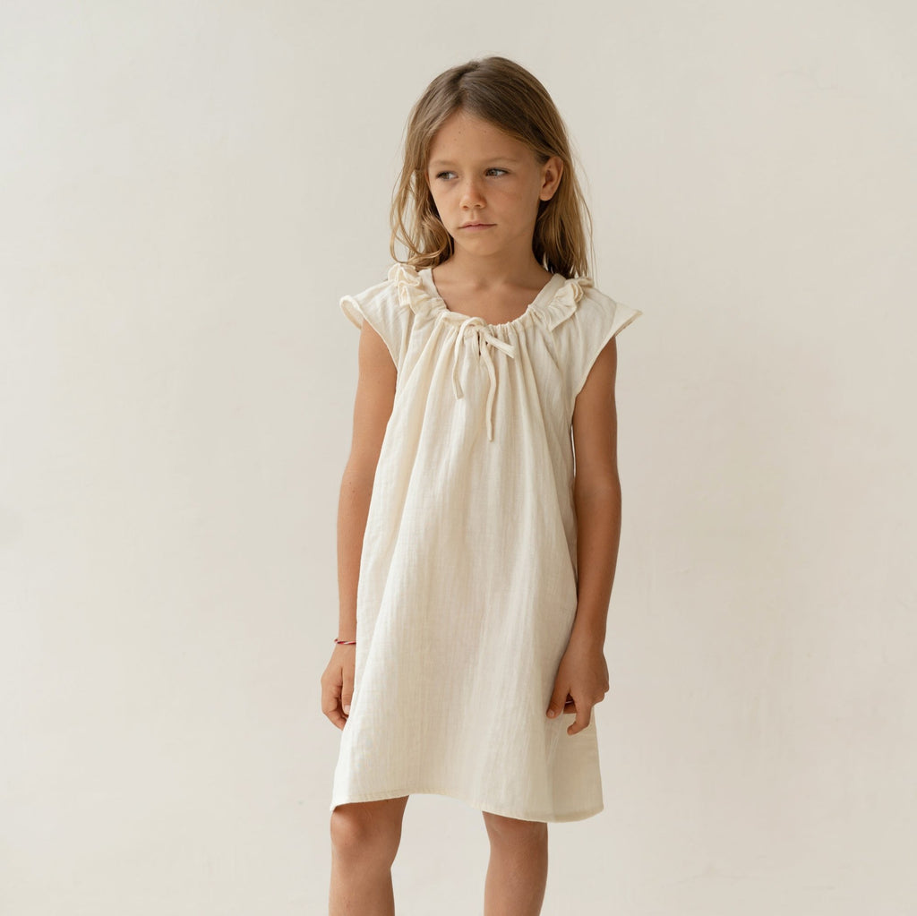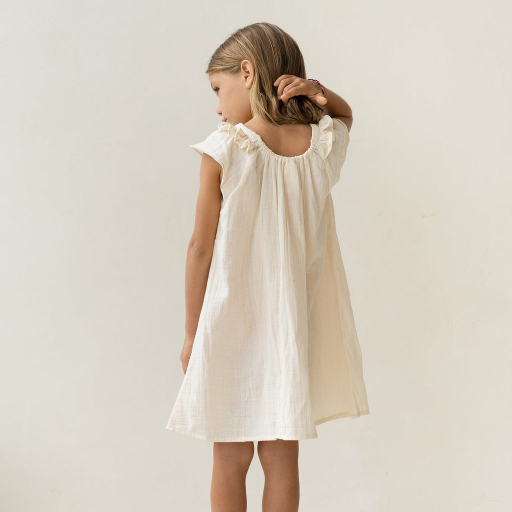 Introducing the Opie Dress in Ecru by Illoura. This enchanting dress features flutter sleeves and a sweet frill neckline with a tie detail, perfect for twirling through summer days. Crafted from lightweight, breathable cotton in a versatile Ecru hue, bringing an effortless feel to every outfit.