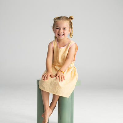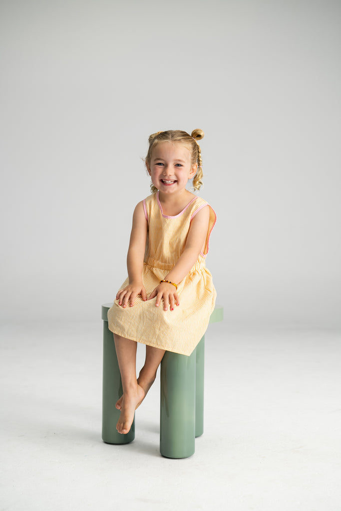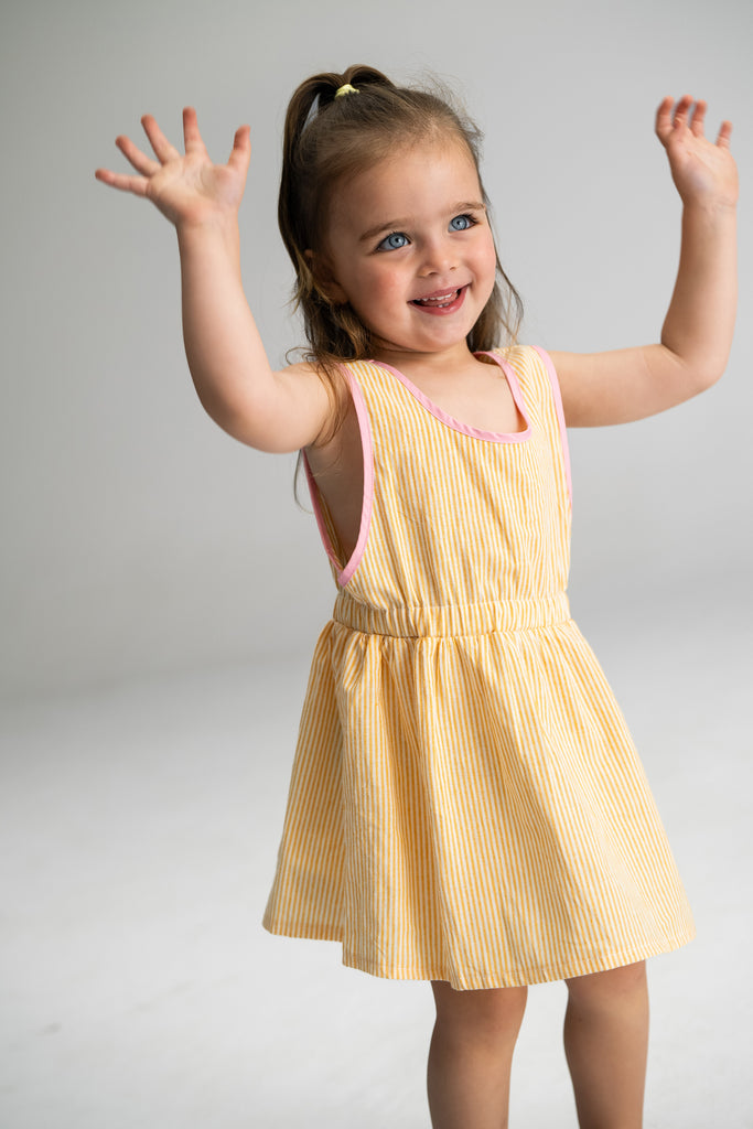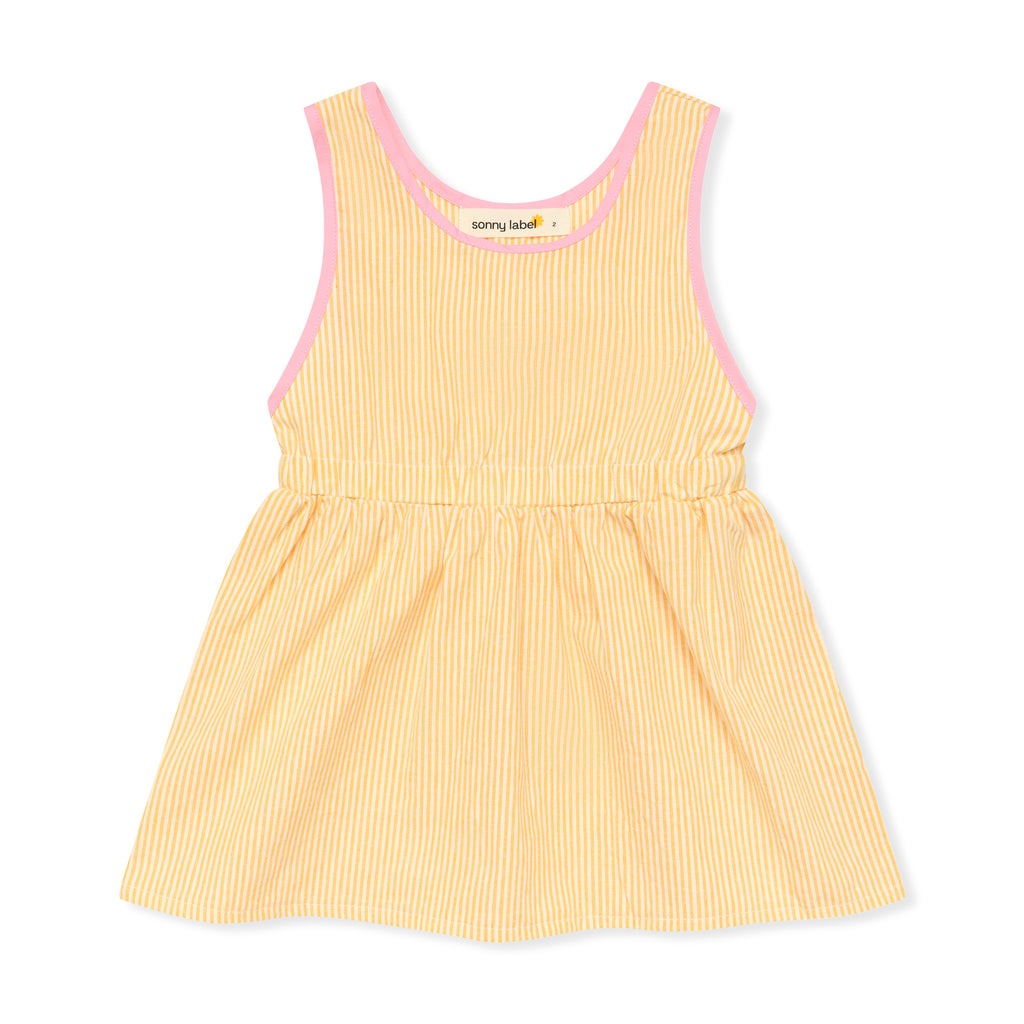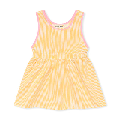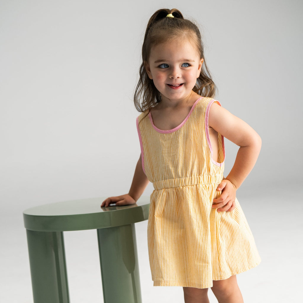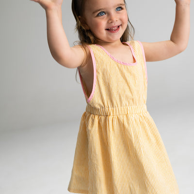 The sweetest Stripe Pinafore Dress in Yellow by Sonny Label. Featuring an elasticated waistband, simple stripes and extra fun with contrast binding.