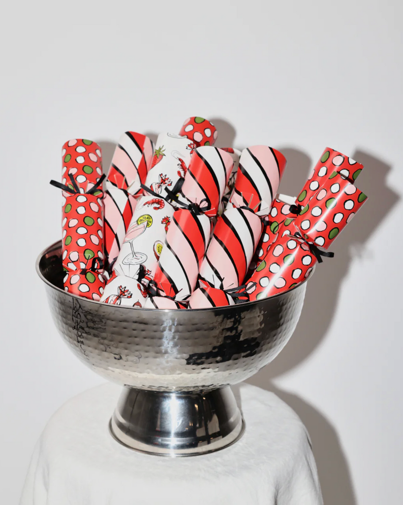 This Set of 6 Christmas Crackers by Studio Milligram feature original illustrations by Billie Justice Thomson and an art gift assortment, including a magnet, badge, wristband, pop-socket, temporary tattoo, sticker, a hat & joke. Billie is known for her vibrant depictions of iconic imagery. This collaboration celebrates familiar festive rituals with playful artworks that pay homage to life's simple pleasures.