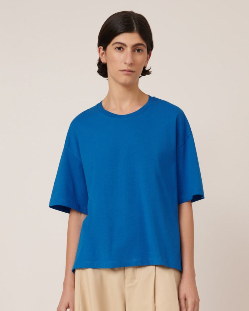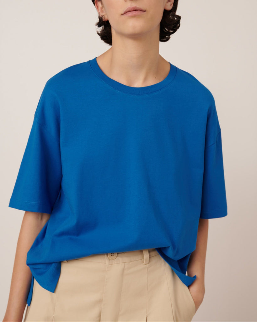 The Everyday Tee is an updated version of Kowtow's beloved Boxy Tee, maintaining the same relaxed fit with added side splits for extra comfort and ease of wear. Slightly cropped in length, this tee offers a modern touch to a classic style, perfect for everyday wear. Crafted from mid-weight organic cotton jersey in a vivid Azure.