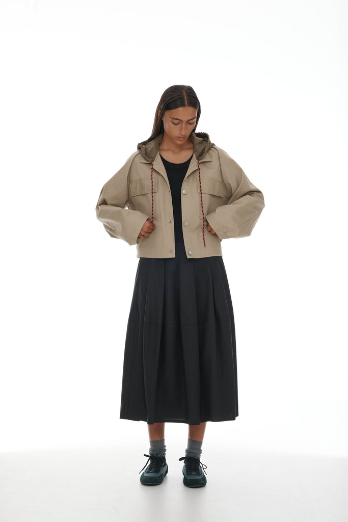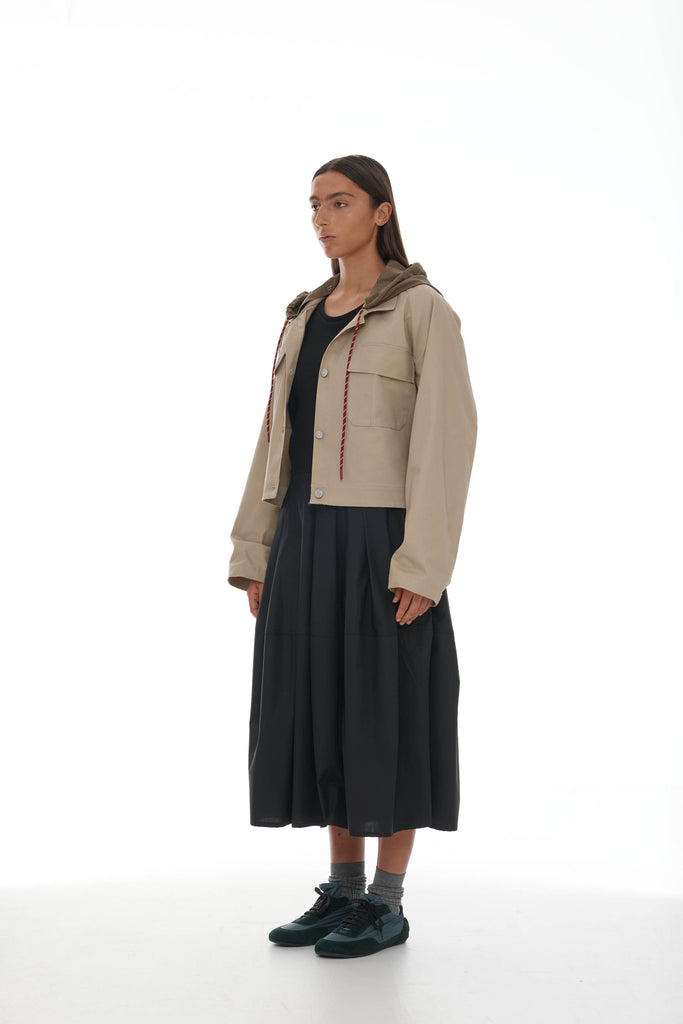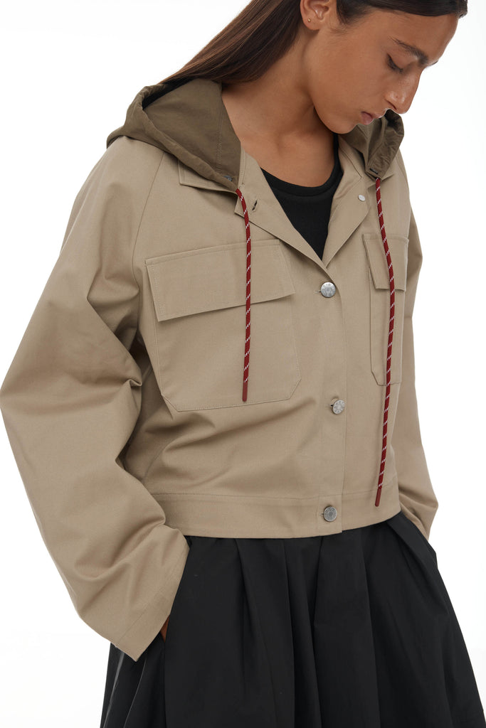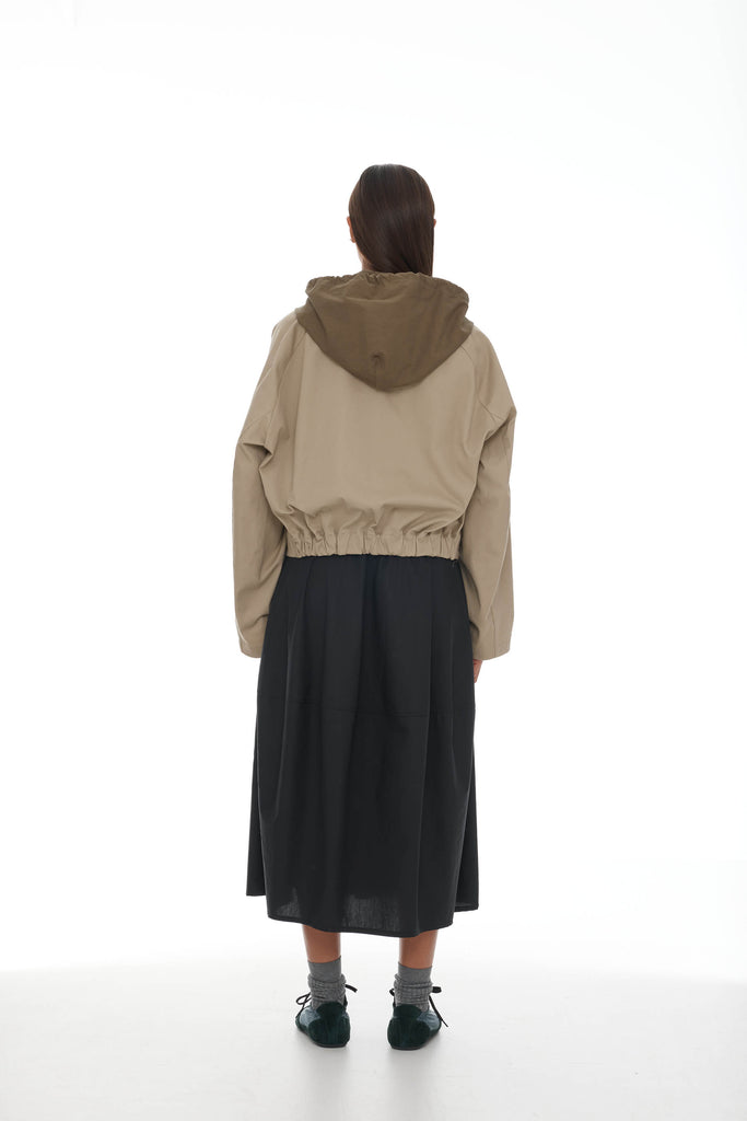 The Mariano Jacket in Sand & Tobacco by Ricochet is expertly crafted for both comfort and style. Its boxy, relaxed fit, raglan sleeves, and dome button closing combine for a chic and relaxed look. The elasticised back waistband ensures a flattering silhouette, and the large front pockets add a practical touch. Made with soft cotton drill, this jacket is durable and fashionable for any occasion. Featuring a detachable cotton hood with contrast sporty ties.