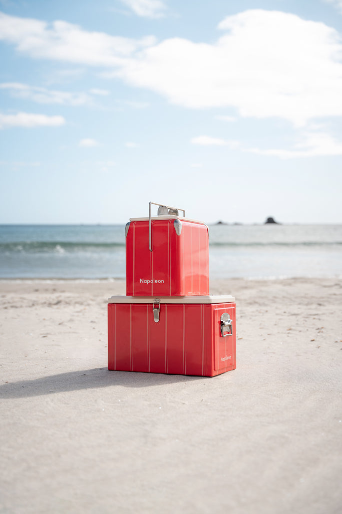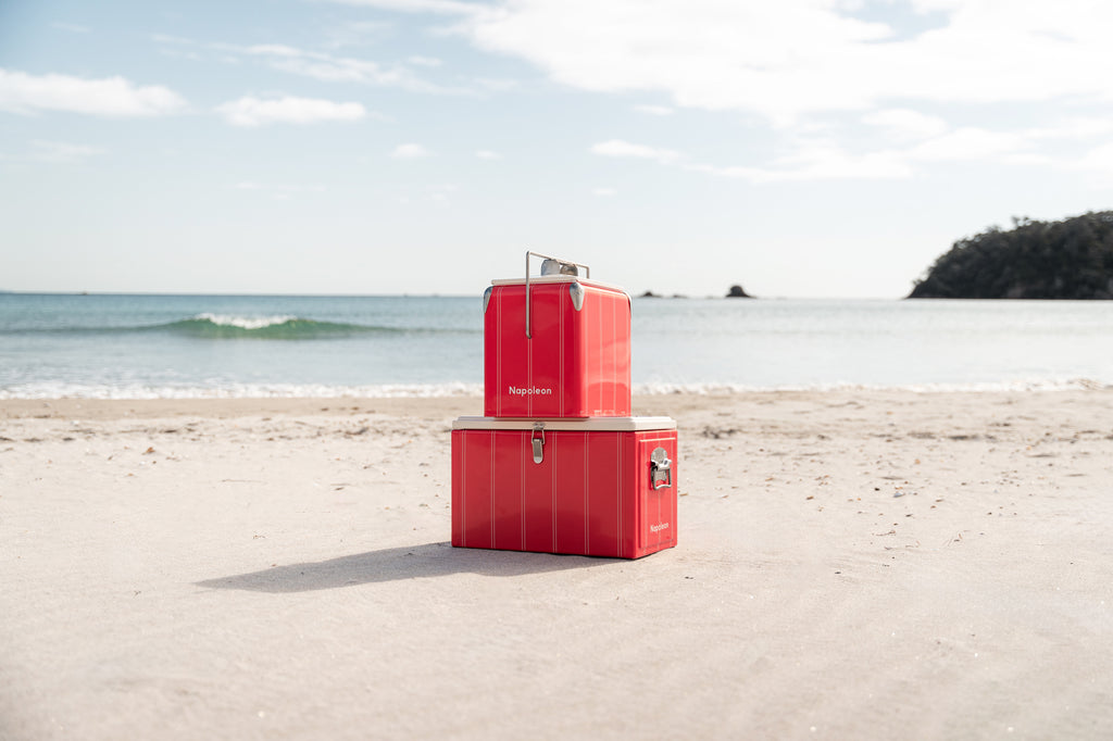The Chilly Bin in Cherry Stripe by New Zealand lifestyle brand, Napoleon Goods. Napoleon Goods has revisited the classic chilly bin with a more lightweight design to accompany your beach, boat and camping adventures. The timeless design ensures perfectly chilled drinks for 12 hours, while stainless steel handles make for a functional, durable cooler that will be enjoyed for generations to come.