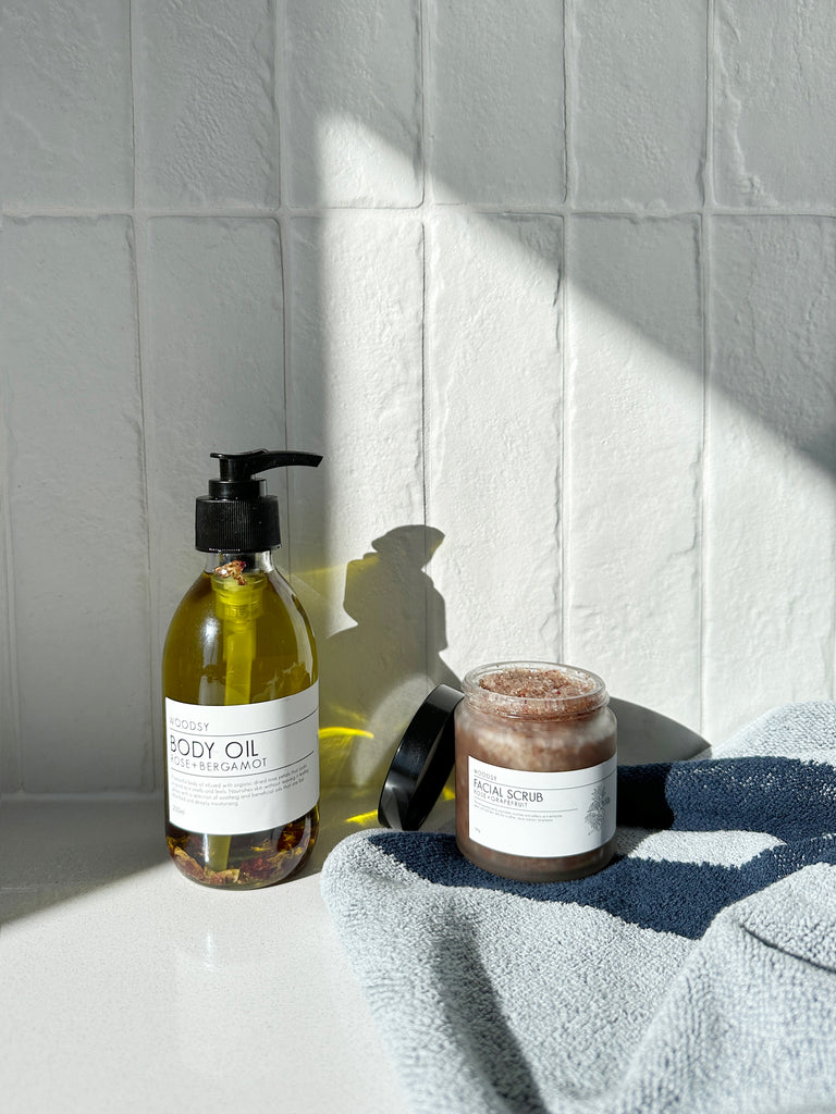 Rose & Grapefruit Facial Scrub by Woodsy Botanics is a concentrated facial scrub made from organic cane sugar and organic dried rose petals which softens, soothes and moisturisers while removing dead skin cells for a more youthful and revived complexion.