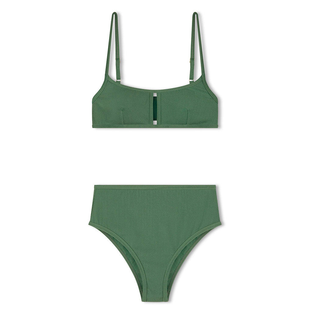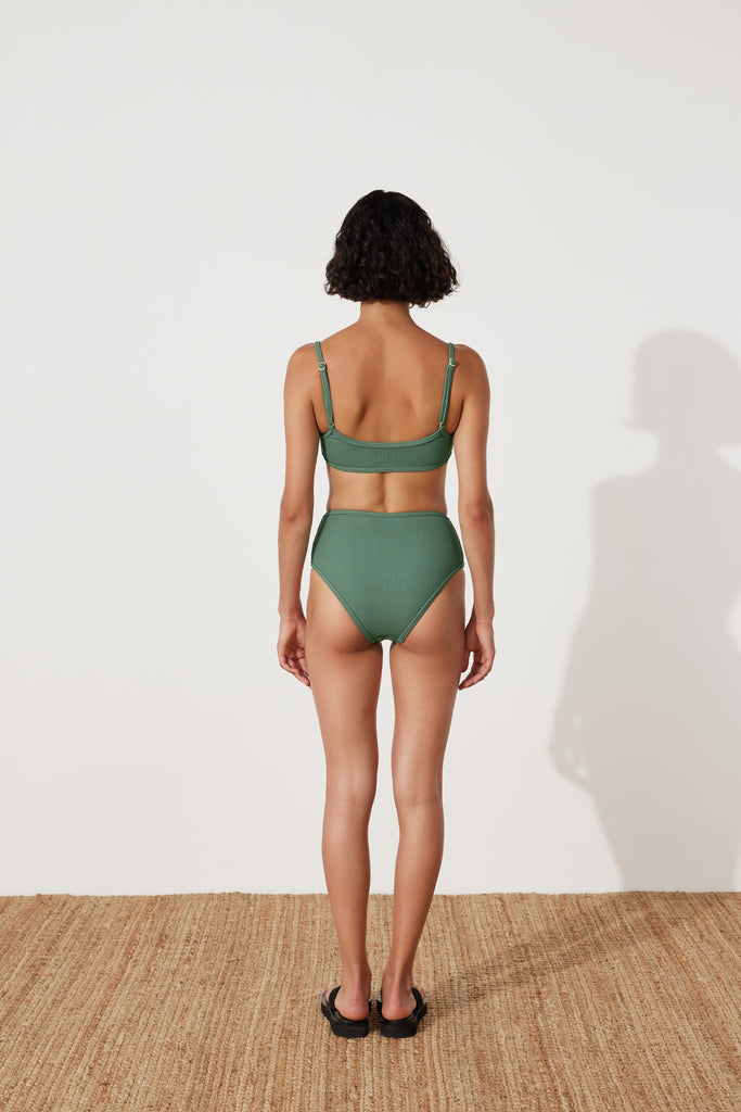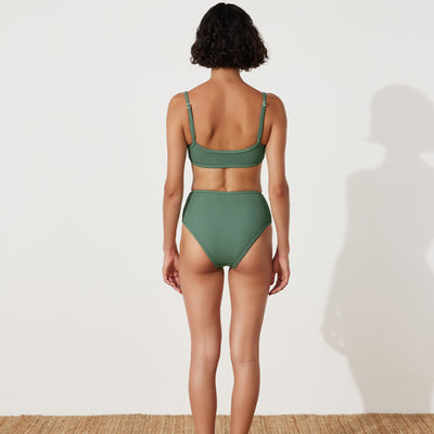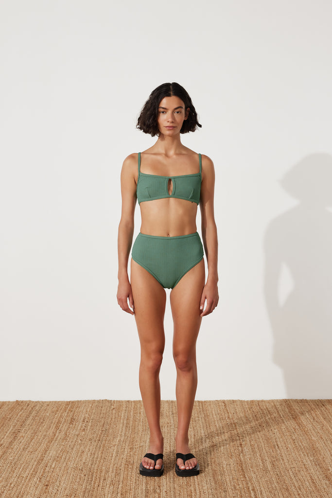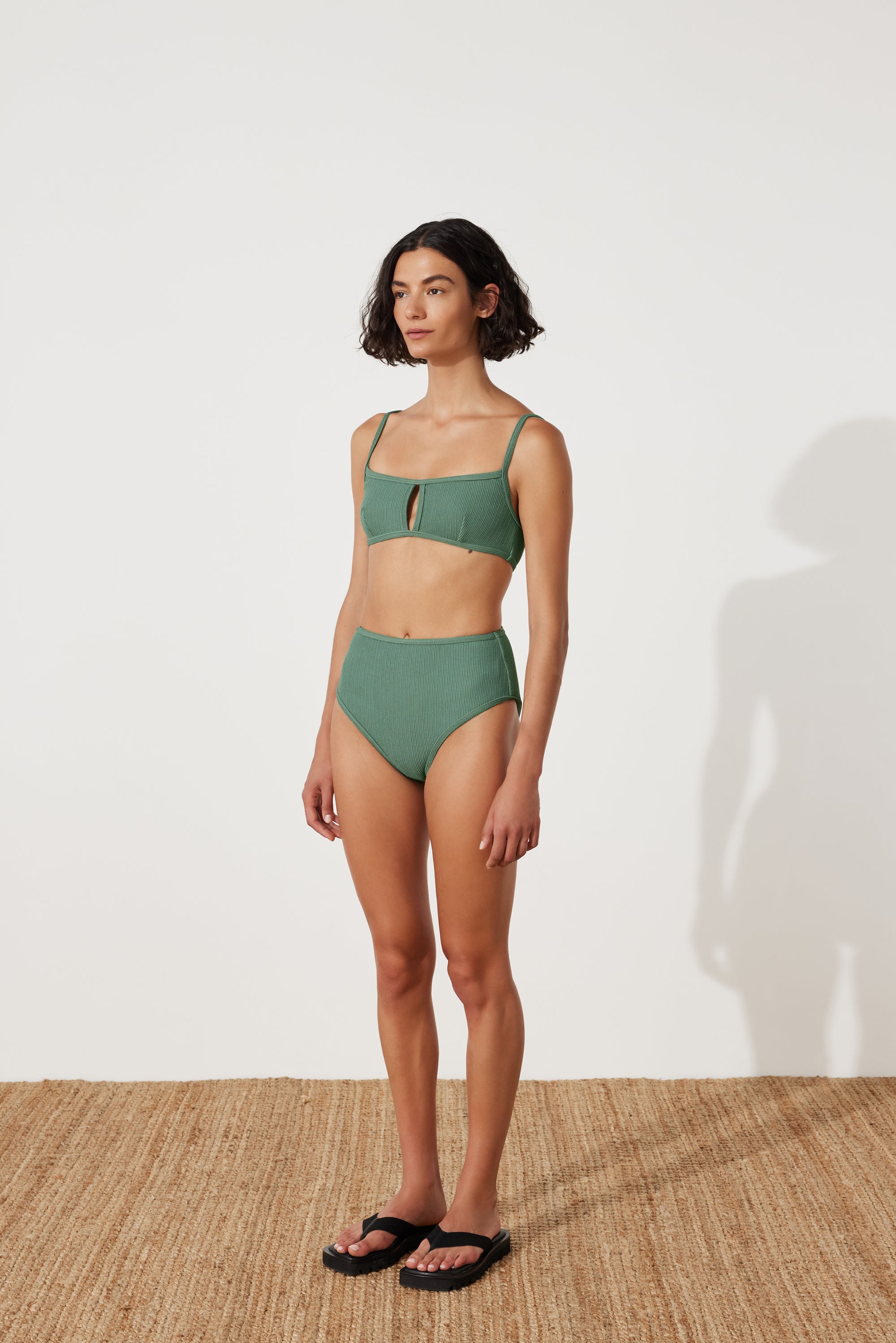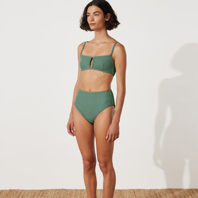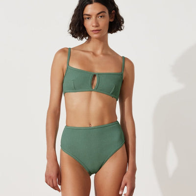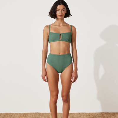 The Emerald Textured High Waist Bikini by Zulu & Zephyr features a soft bust cup with keyhole detailing in a soft textured fabrication with adjustable straps. The bottoms feature a clean high-rise cut that offers fuller coverage on the hips but maintains a refined bikini line.