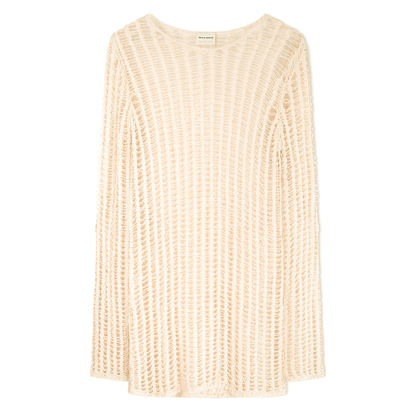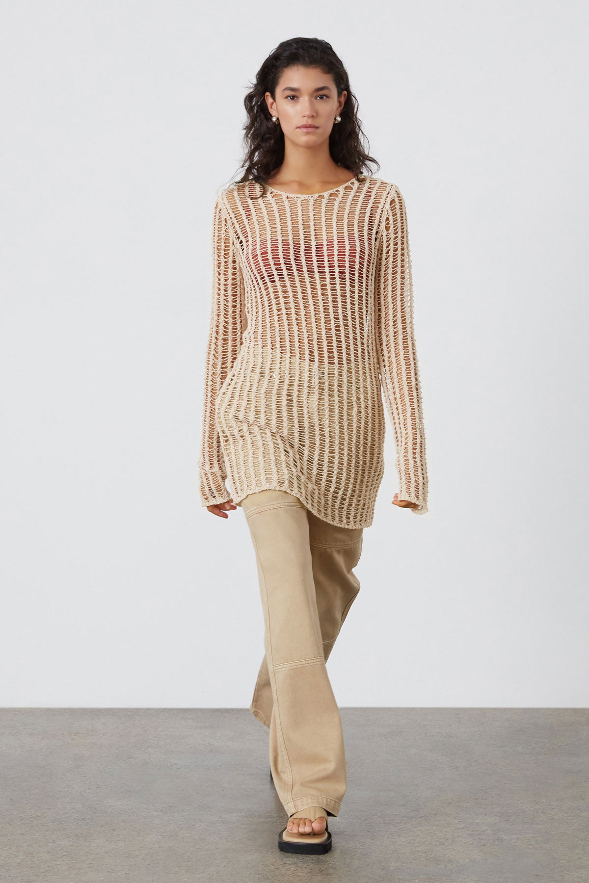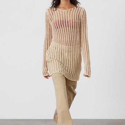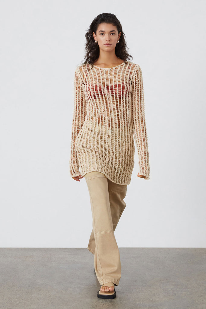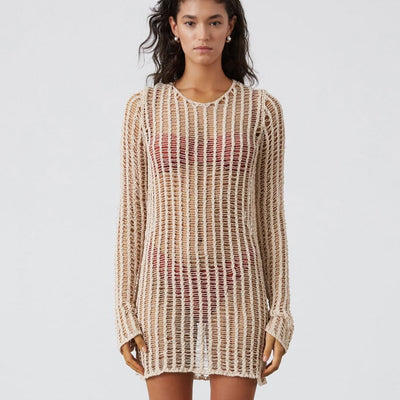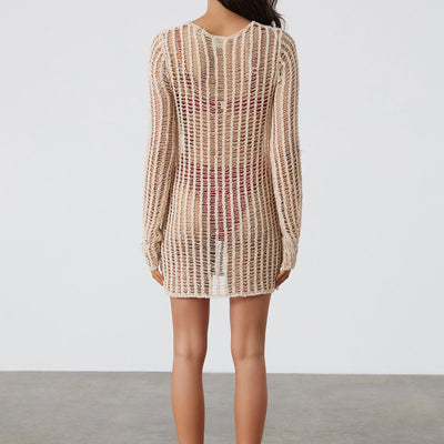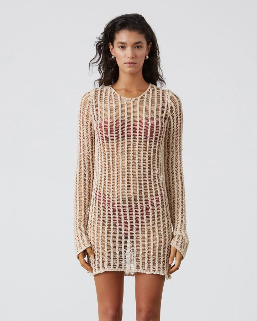 The Natural Lattice Knit Dress by Zulu & Zephyr offers a breezy, lightweight design with its open lattice construction crafted in textured cream yarn with a subtle blush undertone. Featuring a flattering high neckline and long sleeves in a mini length. Perfect for layering over swim or pants, it’s a versatile piece that transitions seamlessly from beachside days to casual evenings.