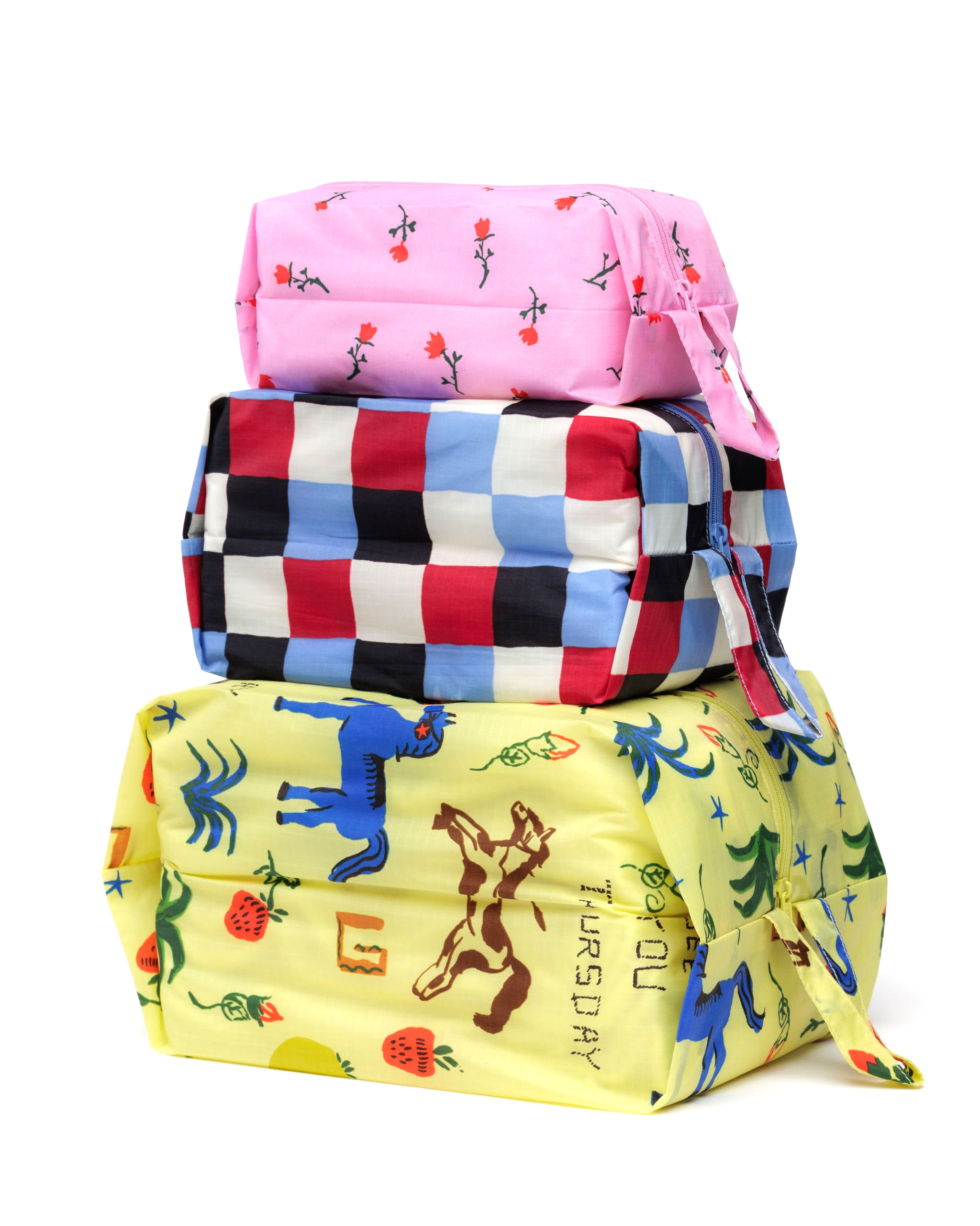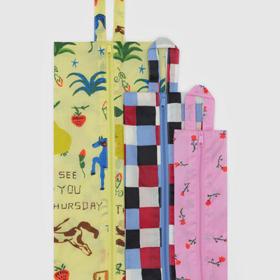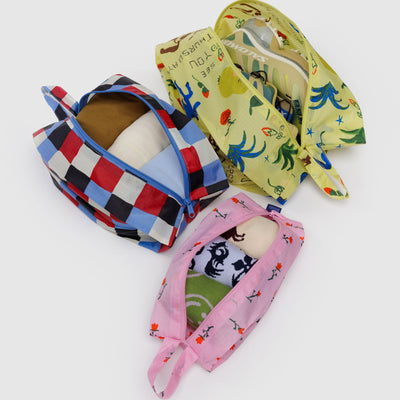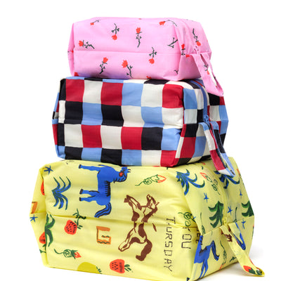 The 3D Zip Pouch Set in Painted Prairie by BAGGU is a set of three zippered pouches for travel and organisation, with loops for carrying and hanging on the go. Perfect for packing, organising your bag or home tidying.