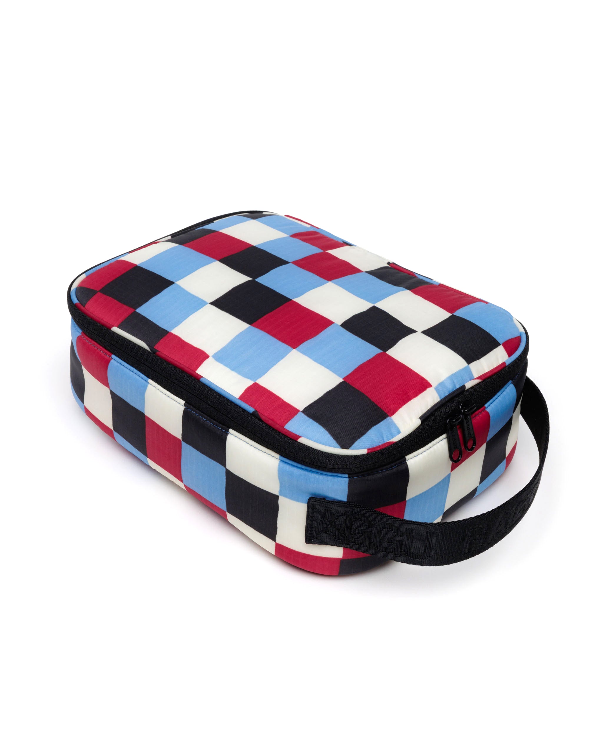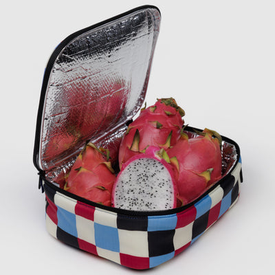 The Lunch Box in Painted Check by BAGGU is an insulated zippered cooler bag that fits into your bag or backpack to keep your meal cool and cushioned. It features a handle on one end for easy carrying.