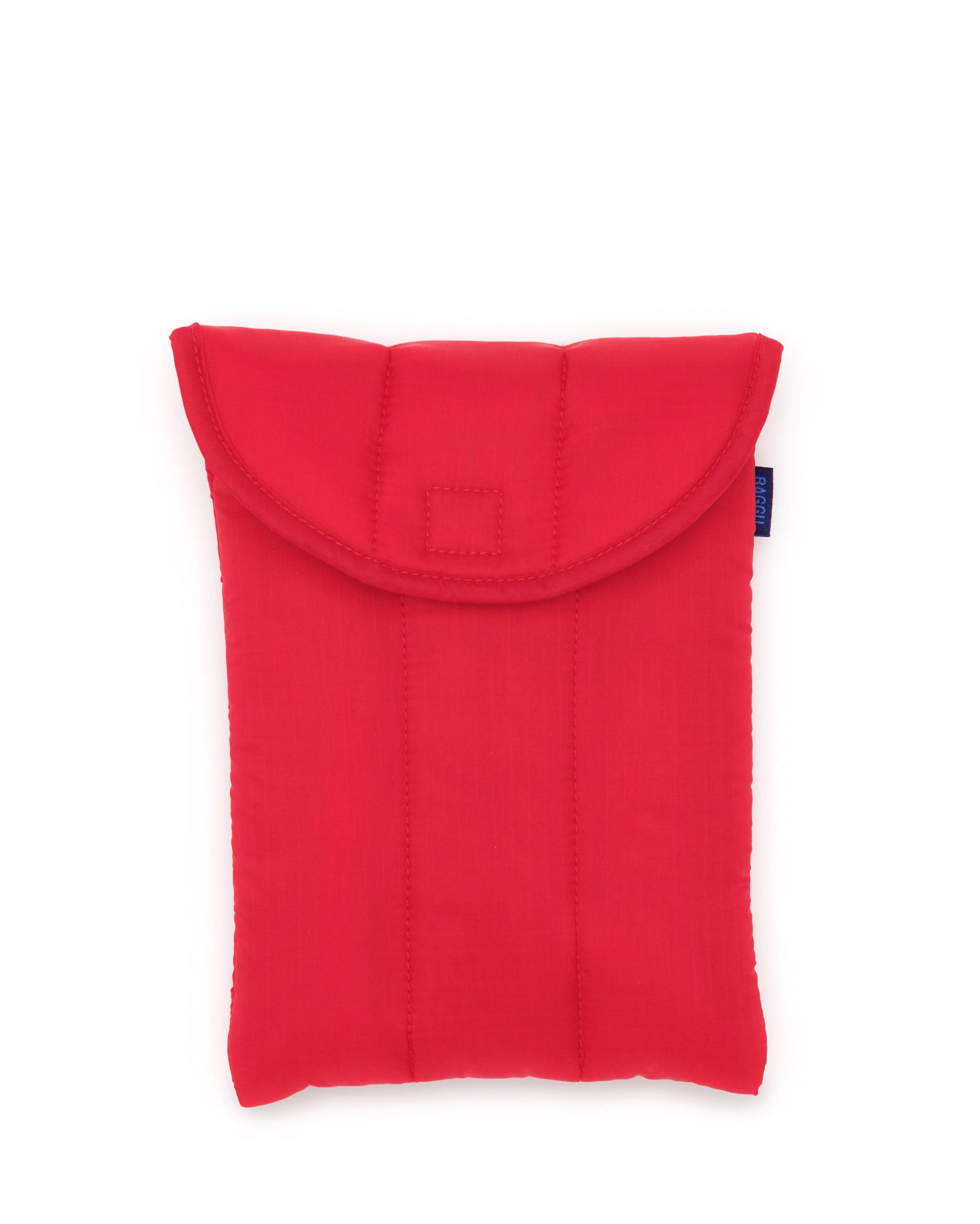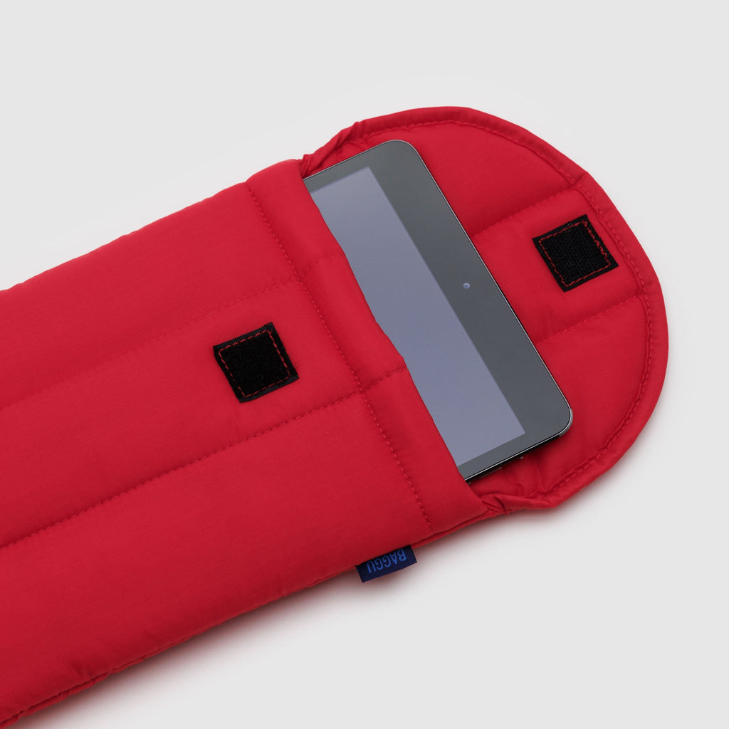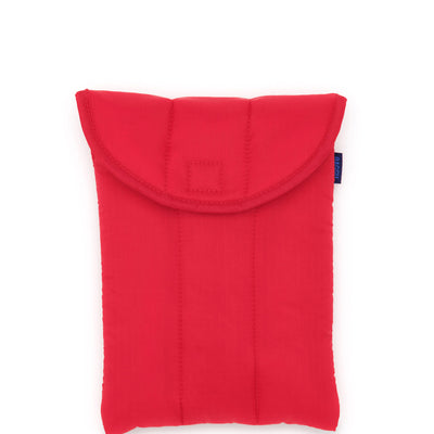 The Puffy Tablet Sleeve in Candy Apple by BAGGU is a quilted home for your iPad or Kindle, or any other tech device, with a velcro closure.