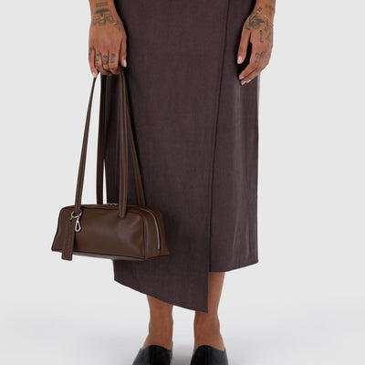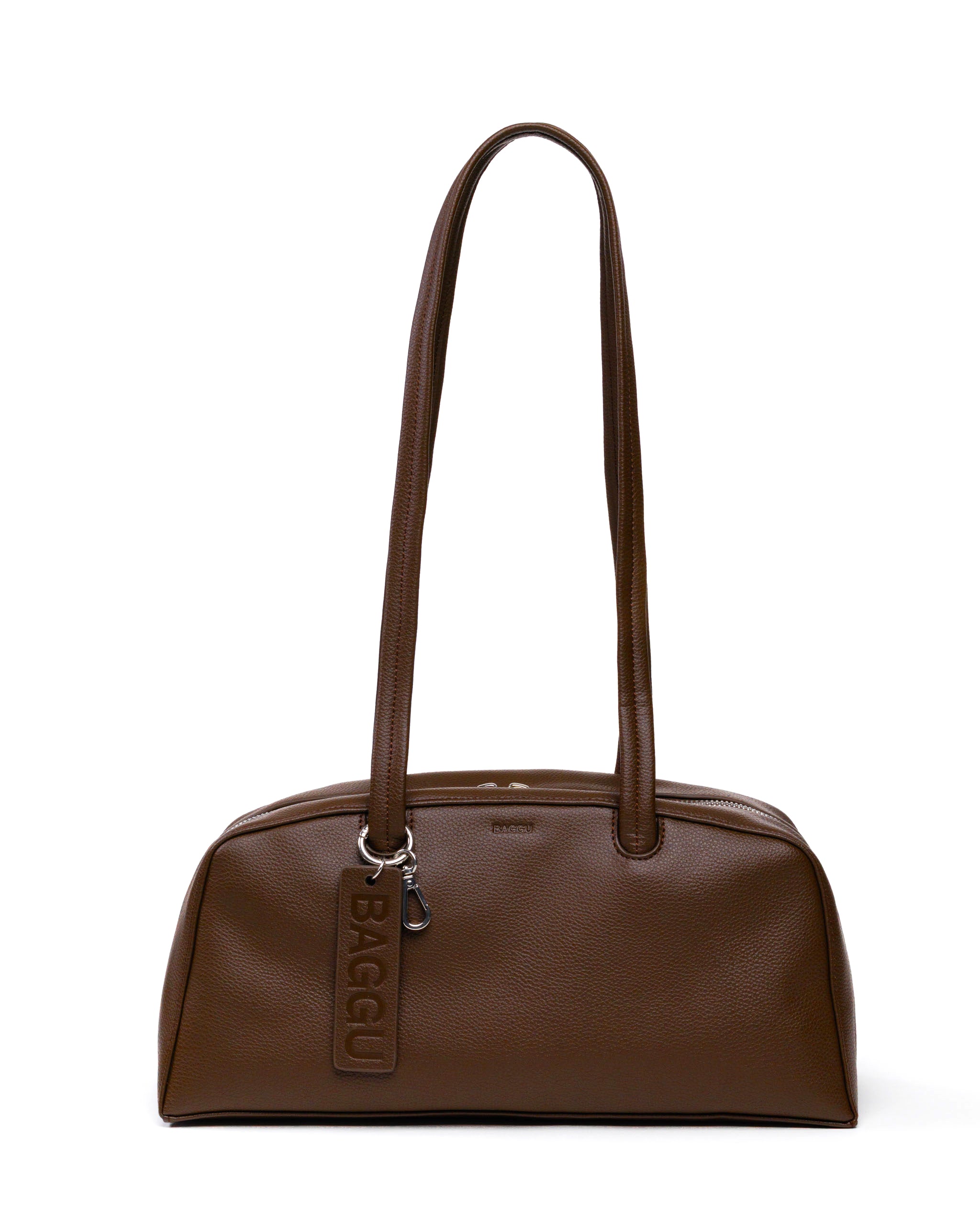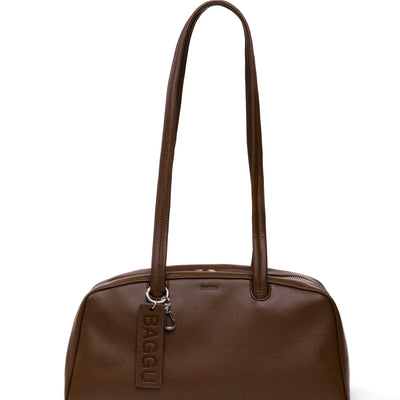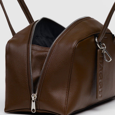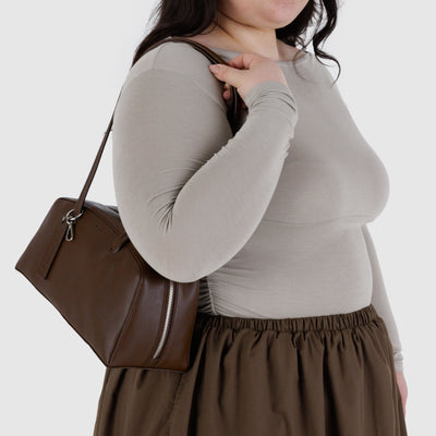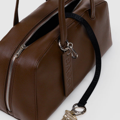 The Recycled Leather Bowler Bag in Brown by BAGGU was designed to be accessorised with the loops & clip rings that let you add a personal touch from every angle. The wide interior includes a convenient zip pocket and room to carry more than the essentials. The interior features a key leash with a metal spring clip, so your keys are never hard to find.