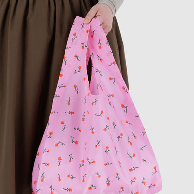 The Standard Carry Bag in Painted Wildflower by BAGGU is a best-selling reusable bag that isn't just for the grocery store. It goes everywhere and hauls almost anything. The standard size can hold up to 22.5 kgs (50lbs) and can hold 2-3 grocery bags' worth of goodies comfortably in your hand or over your shoulder. It folds into itself and into the flat pouch when not in use.