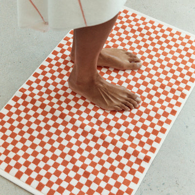 Beppu Bath Mat in Paloma Sun & Ecru by luxury towelling brand, BAINA. Luxuriously soft, Beppu features a playful checkerboard print, synonymous with the BAINA brand. This bath mat makes for a subtle disruption in any bathroom or ensuite. Pairs nicely with the Josephine Hand Towel.