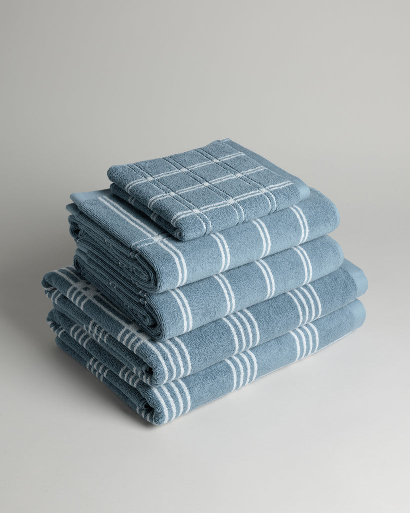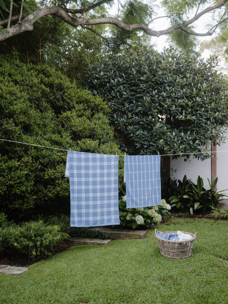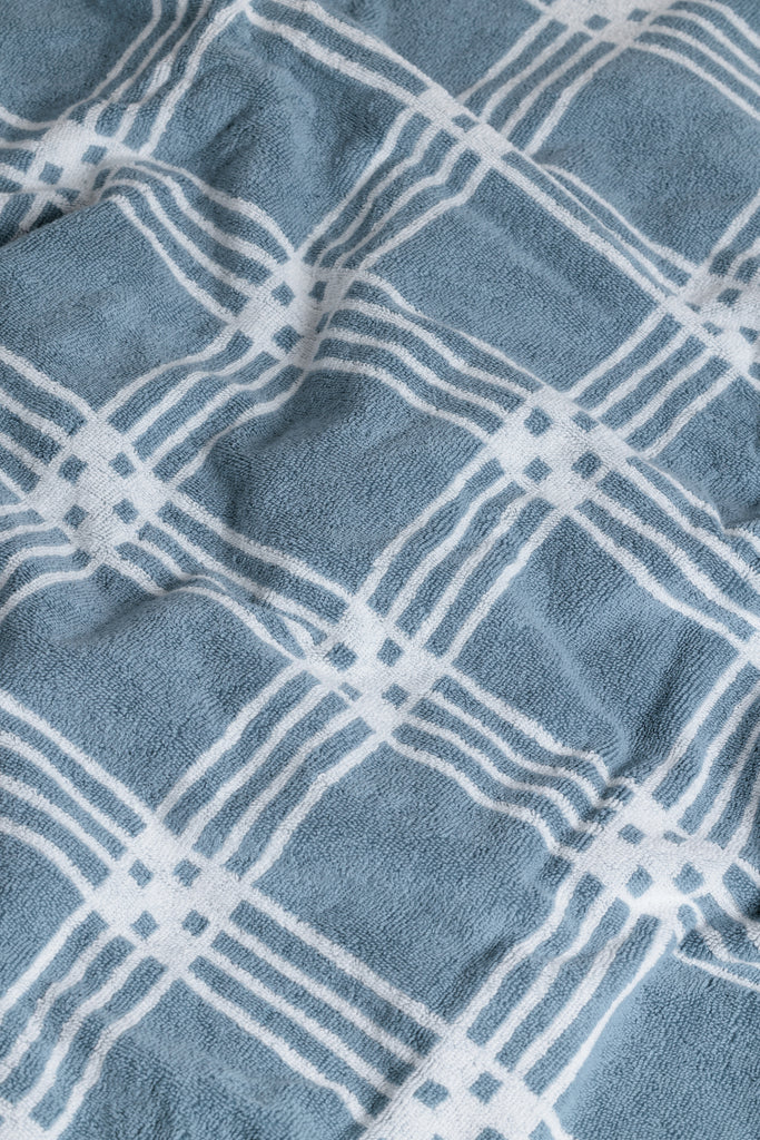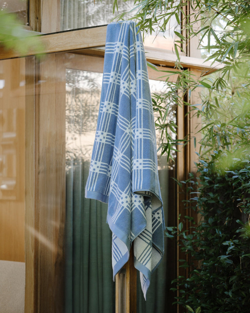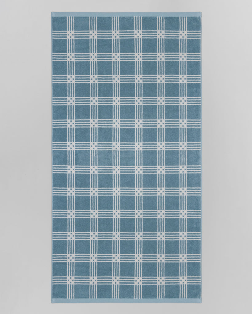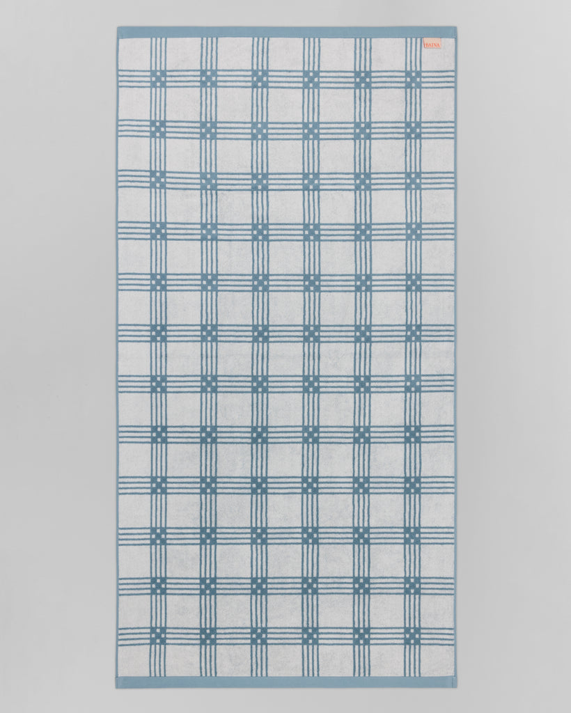 Frisa Pool Towel in Celeste & Chalk by luxury towelling brand, BAINA, a part of their Modern Tartan collection. Defined by a repeating, graphic tartan motif, the Frisa Pool Towel creates a measured rhythm that feels distinctly modern. Crafted from 100% organic cotton, the Frisa is luxuriously soft.