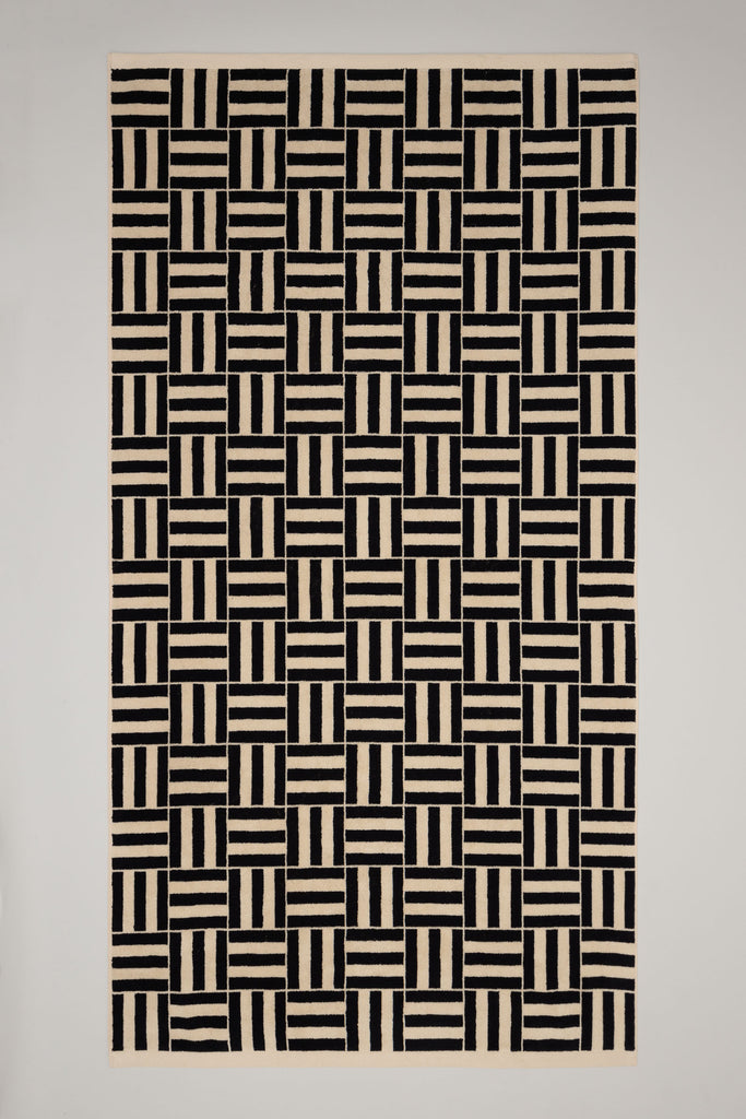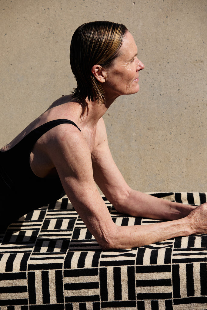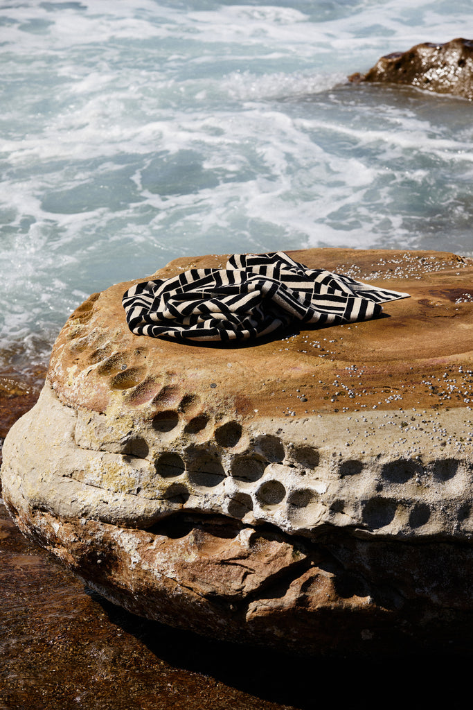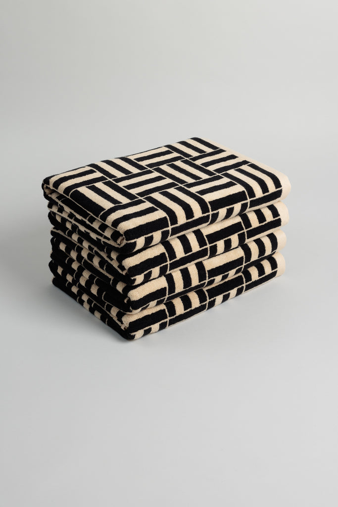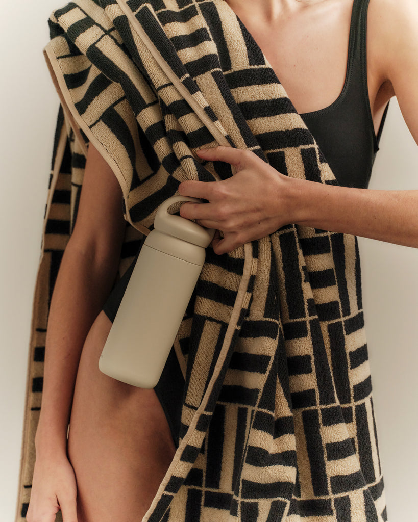 Willis Pool Towel in Sand & Noir by luxury towelling brand, BAINA. Defined by a geometric weave print, the Willis Pool Towel is inspired by the rhythmic repetition seen in Art Deco tiling. Crafted from 100% organic cotton, the Willis is luxuriously soft. Evoke a sense of modernity oceanside or in the bathroom.