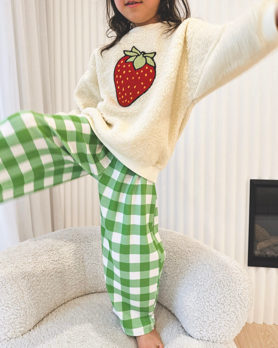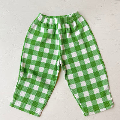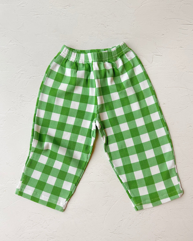 The light weight Green Check Waffle Pants by Bel & Bow feature a custom-printed buffalo check pattern. They are an easy pull-on style with an elasticated waist, a roomy and comfy fit with slightly tapered legs, making these the perfect playtime pair of pants.