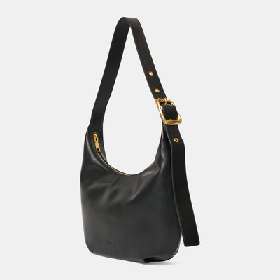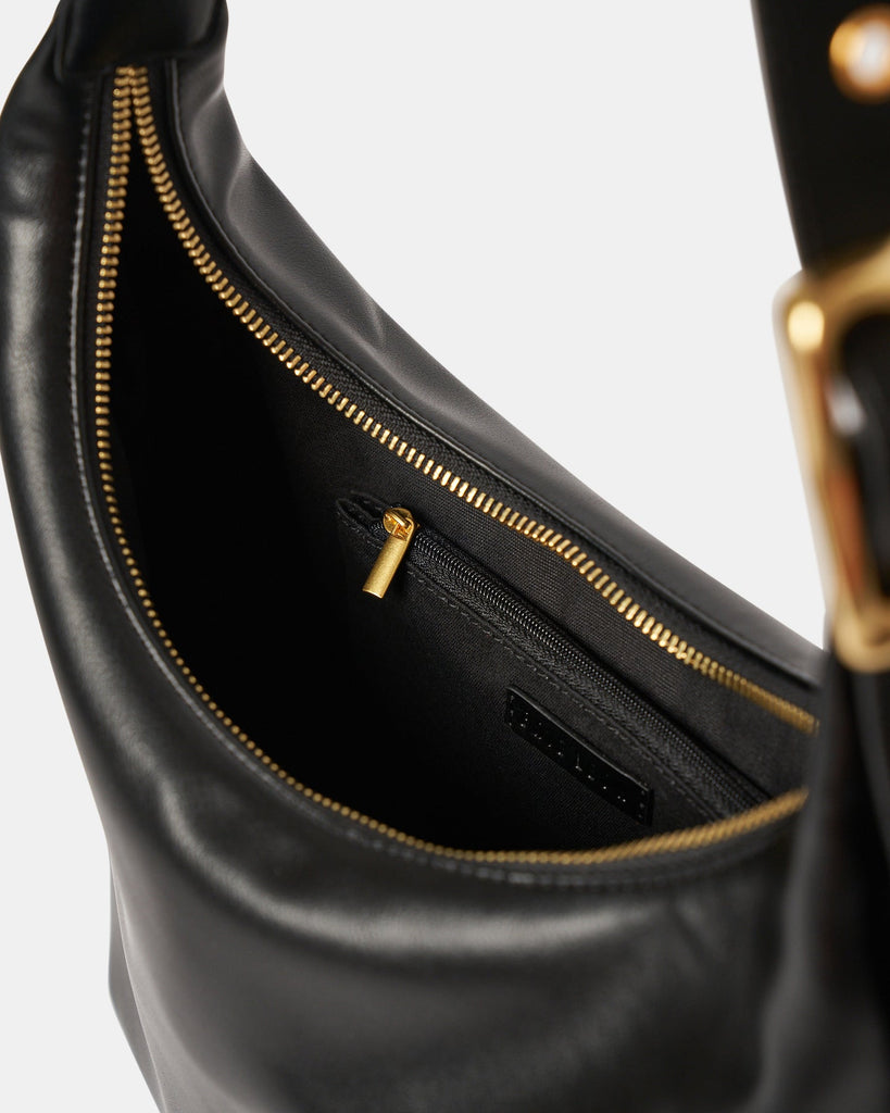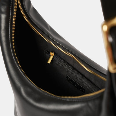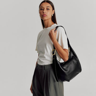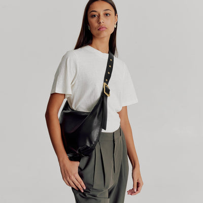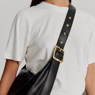 This large version of the most-wanted Everyday Croissant Bag in Black by Brie Leon. Embellished with a brass buckle and multiple eyelets to adjust to the ideal length, its ample size takes you from work to the weekend. Featuring a zip closure and two internal pockets, the Large Croissant has everything you need in a daily bag.