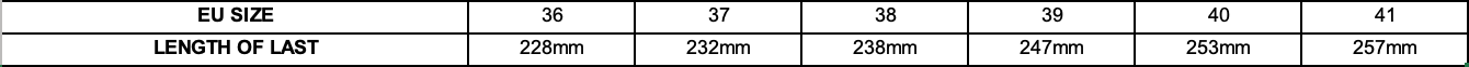 Sizing: Please measure the length of your foot to allow 6-10mm more to last length otherwise toes will hit the end of the shoe. E.g. if you measure 255mm you will take approx size 40 or 41. Please refer to the size guide image for lengths.