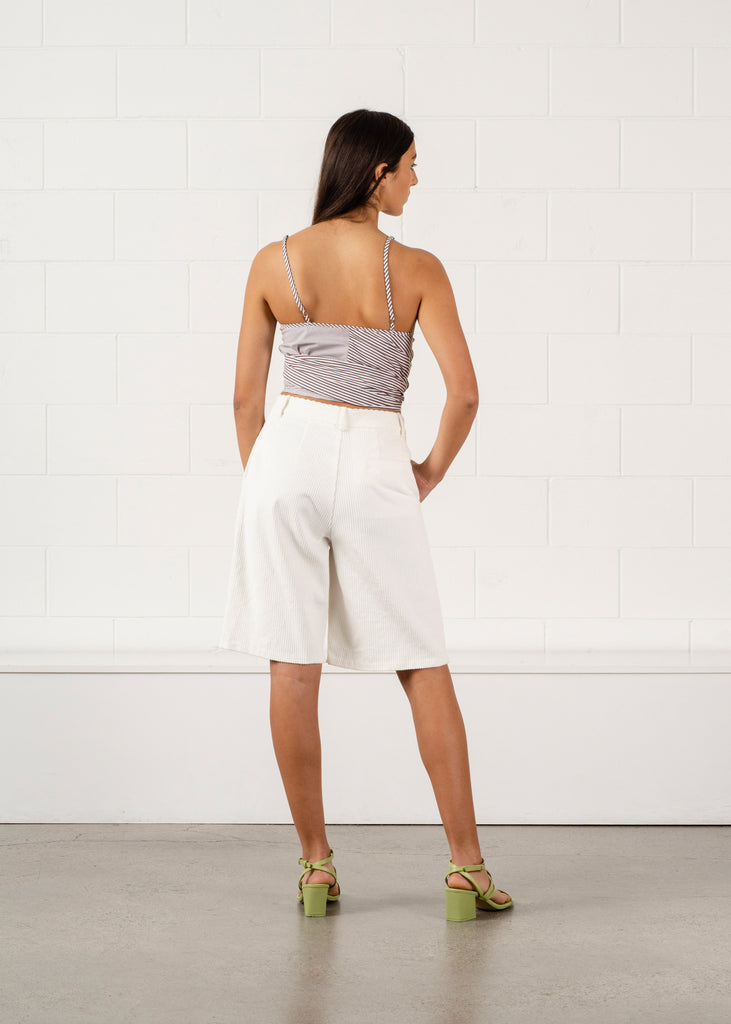 The Dalton Wrap Top in Brown Stripes is made up of subtly contrasting narrow and wide stripe fabric. This style can be tied in various ways and has adjustable sliders on the straps.