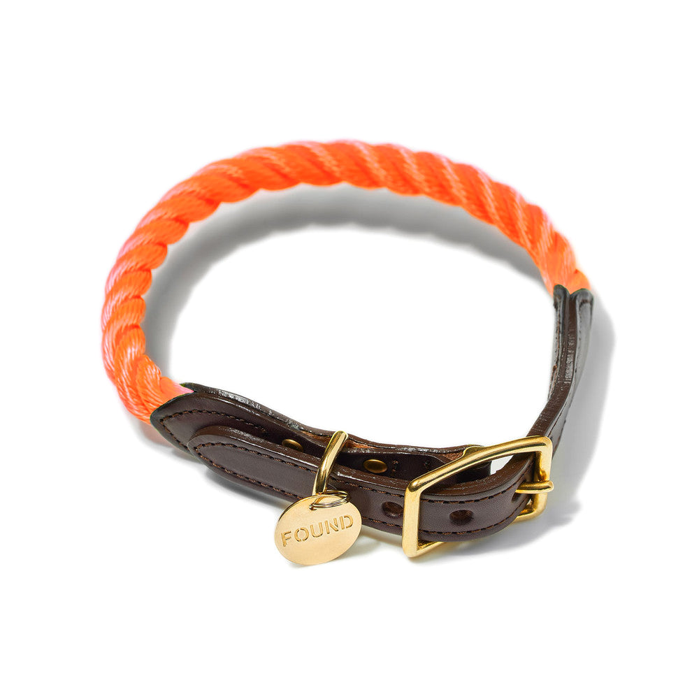 Bright Orange Rope Dog Collar by New York-based designers, Found My Animal. This synthetic dog collar is hand-spliced and finished with leather and brass fixings for added durability. The collar will soften with wear and is perfect for everyday use, including rainy days.