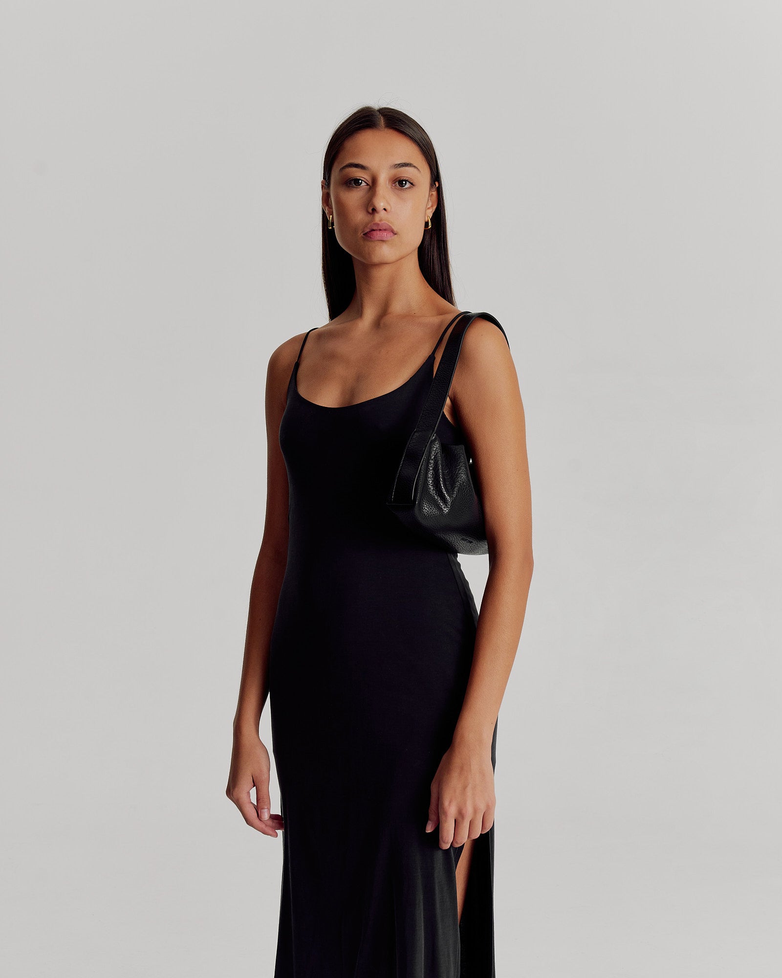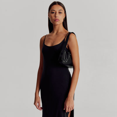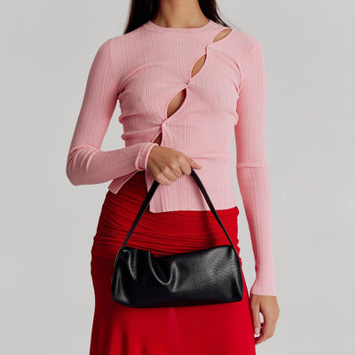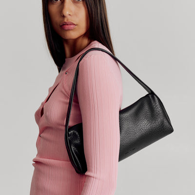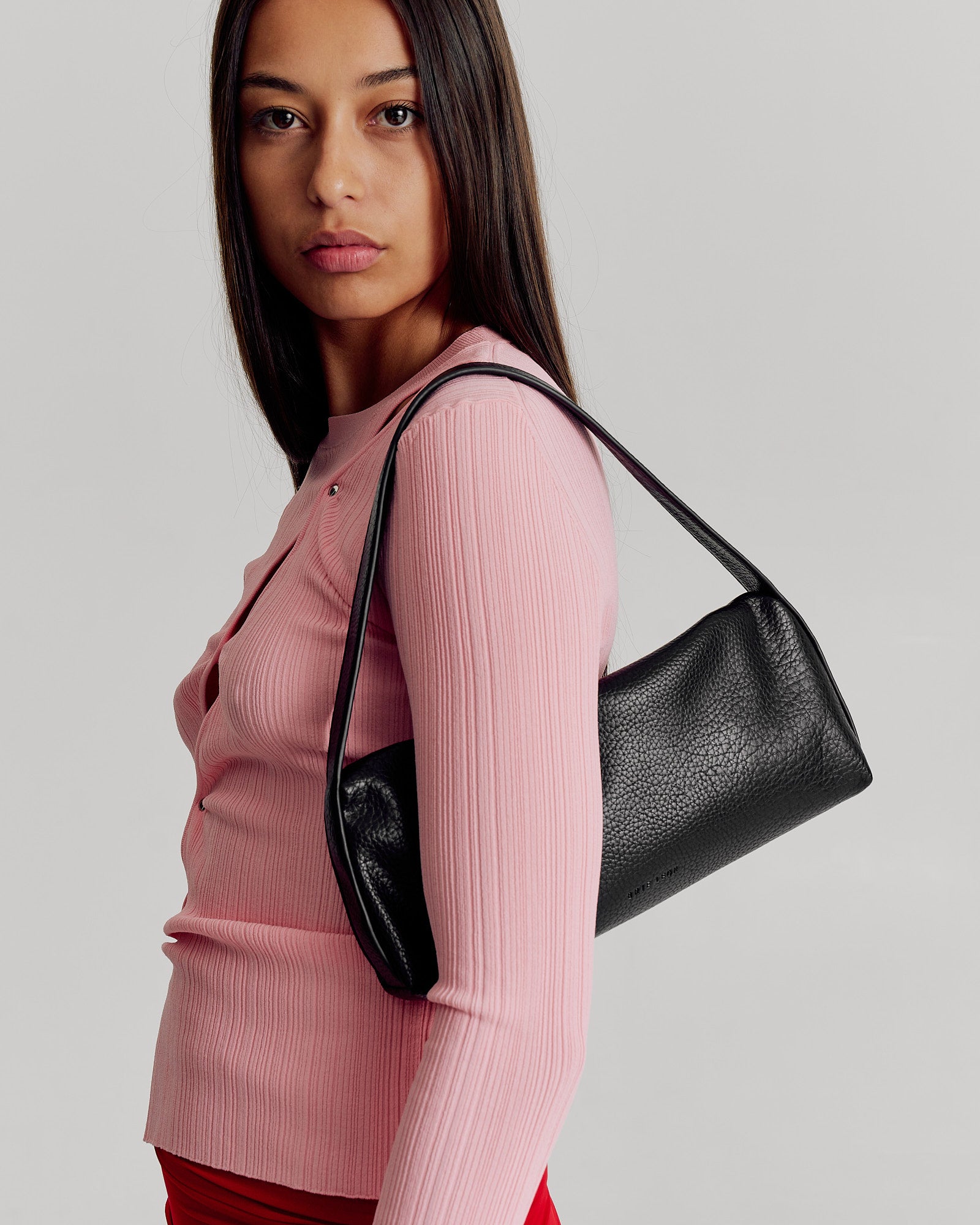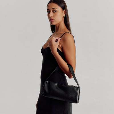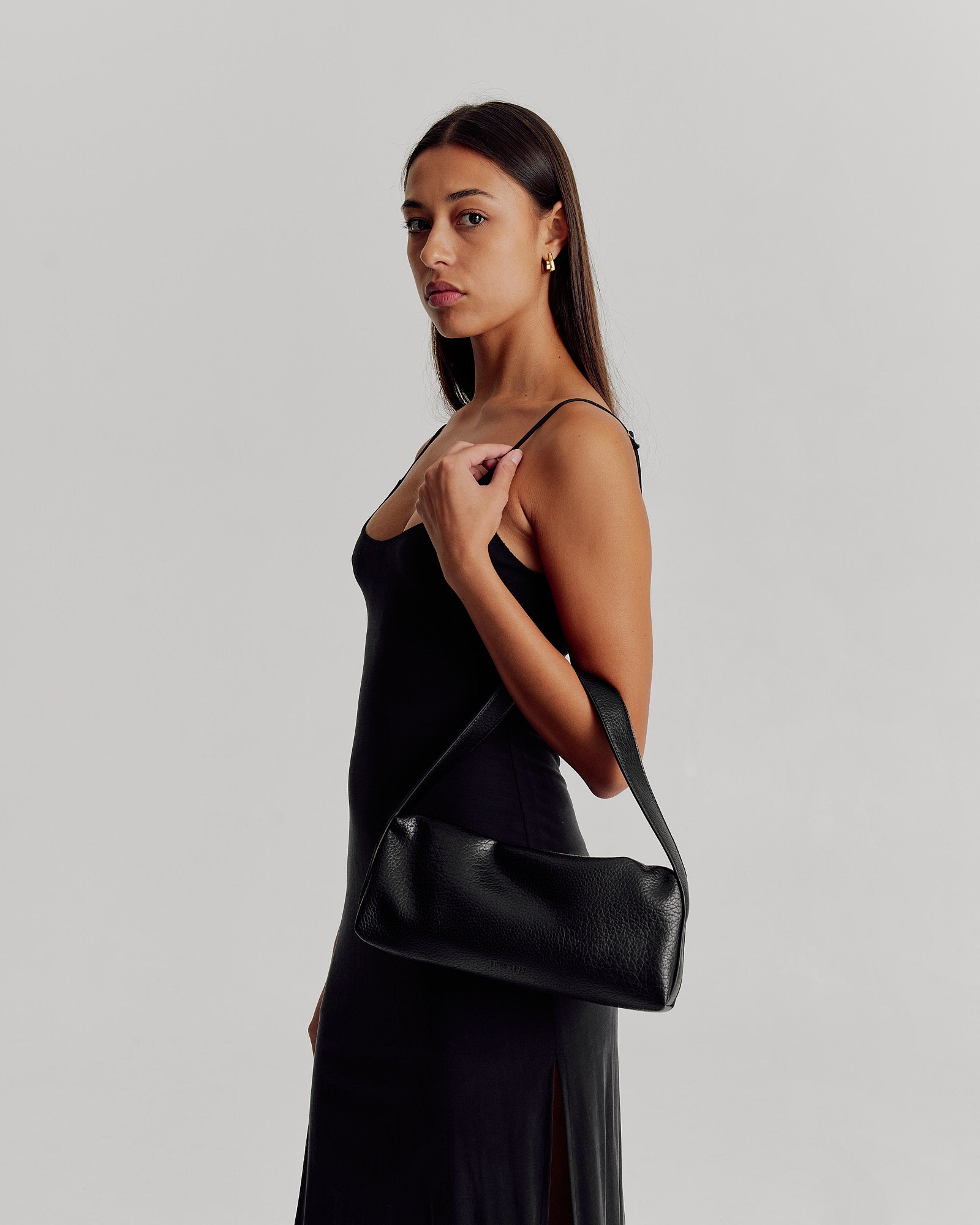 A slimline take on a classic baguette shape, the Harlow Slouch Baguette in Black by Brie Leon speaks to quiet refinement. Its flexible construction and soft nappa fabrication are offset by a reinforced shoulder strap in the same textile.