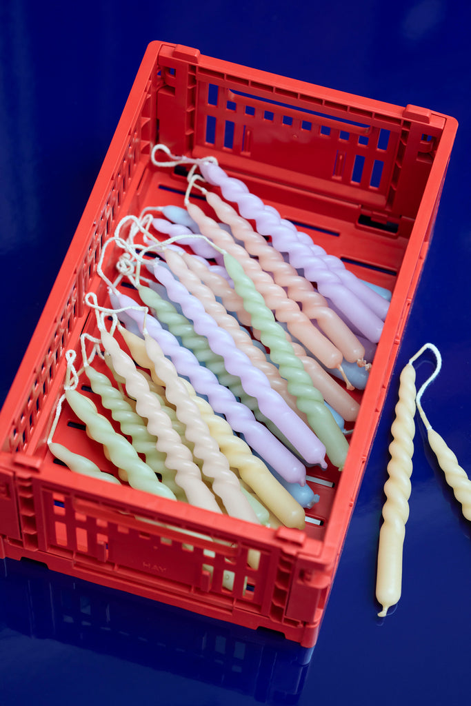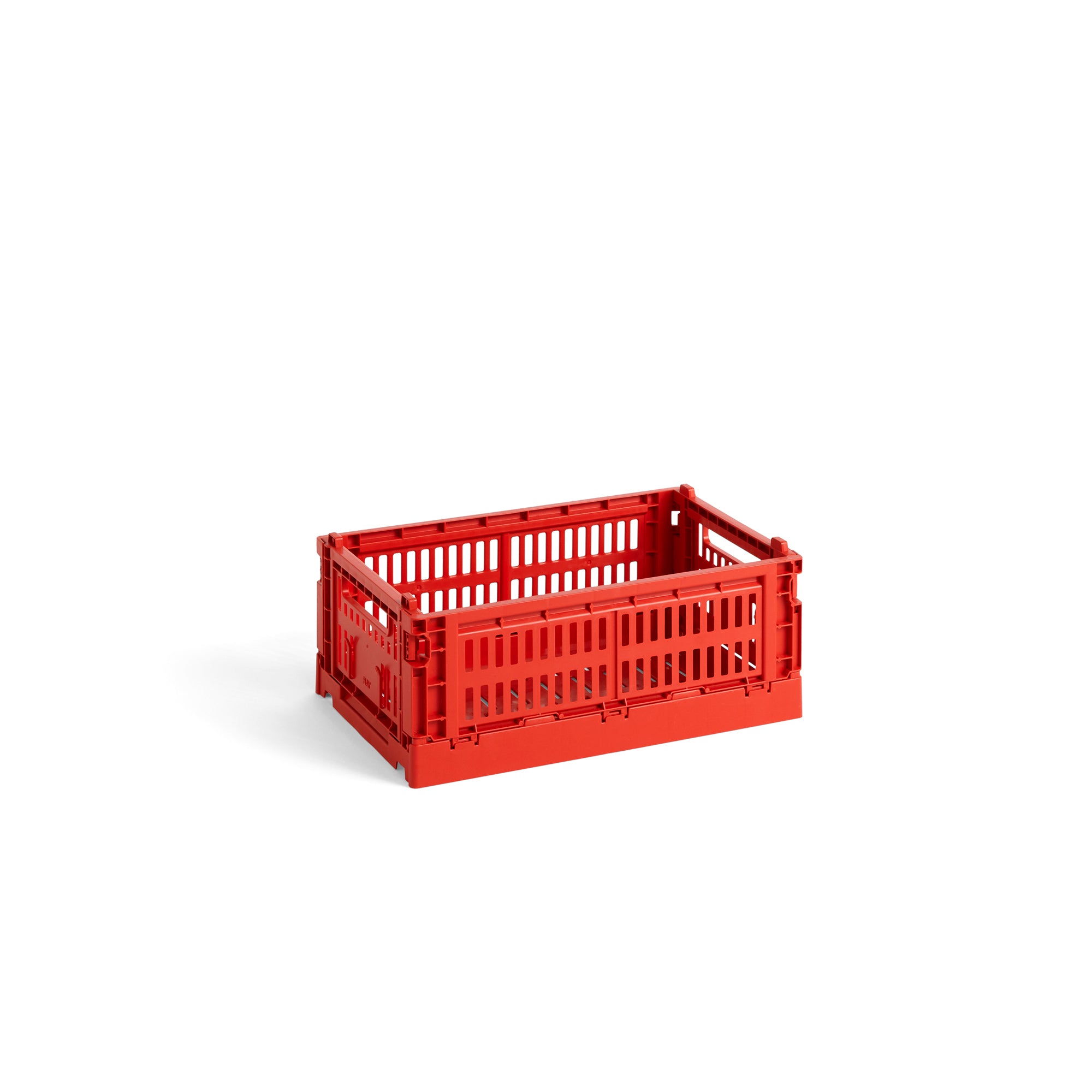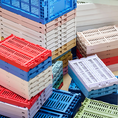 The HAY Colour Crate is a series of colourful storage boxes with a distinctive, perforated design. Made from 100% recycled post-consumer plastic waste in a variety of colour-blocked designs and sizes, the crates can be stacked on top of one another in different size combinations. The crates are suitable for storing and organising items on shelves, tables or inside cupboards.