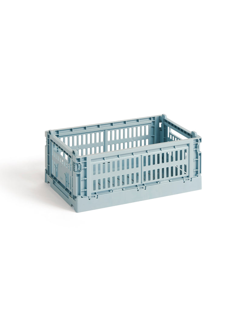 The HAY Colour Crate is a series of colourful storage boxes with a distinctive, perforated design. Made from 100% recycled post-consumer plastic waste in a variety of colour-blocked designs and sizes, the crates can be stacked on top of one another in different size combinations. The crates are suitable for storing and organising items on shelves, tables or inside cupboards.