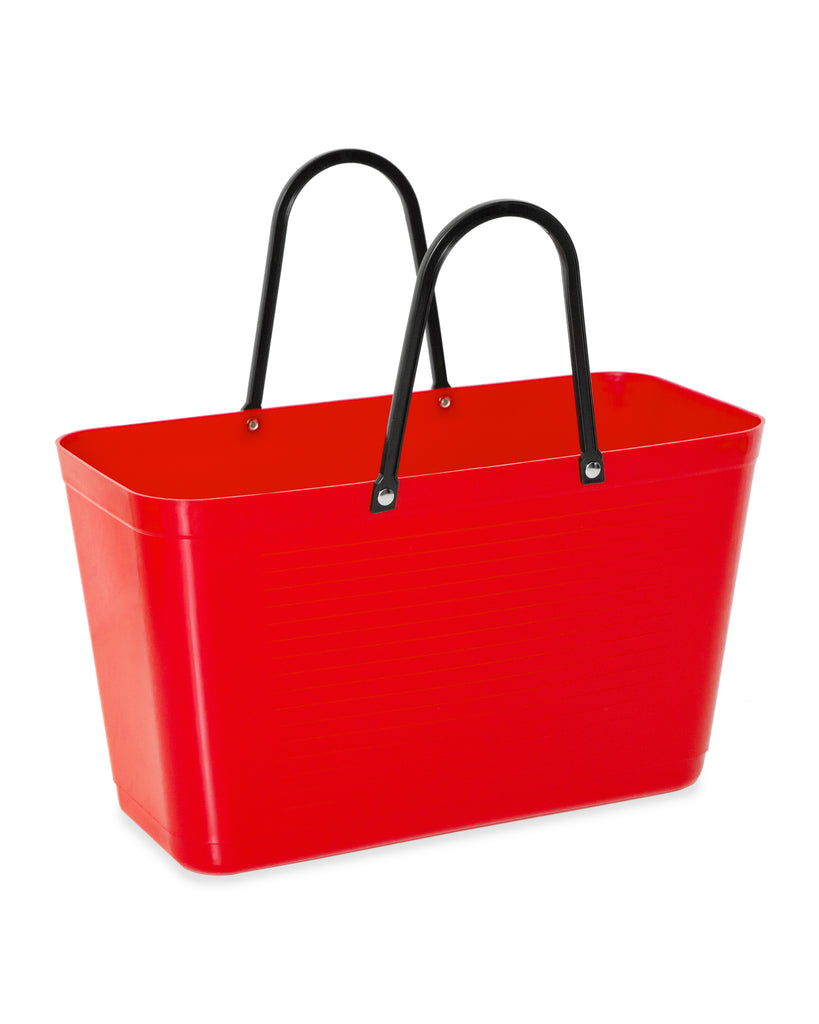 The Large reusable plastic bucket bag in Red by Scandinavian-based brand, Hinza. All Hinza bags are long-lasting, durable and recyclable, thus saving additional natural resources and minimising any environmental impact. The classical stylish shape makes it fit anywhere, and the plastic material allows it to withstand almost anything it is exposed to. The Hinza bag is an obvious choice for picnics and outings like pool parties and shopping trips and is perfect for hobby and gardening jobs as it is sturdy and easy to clean.